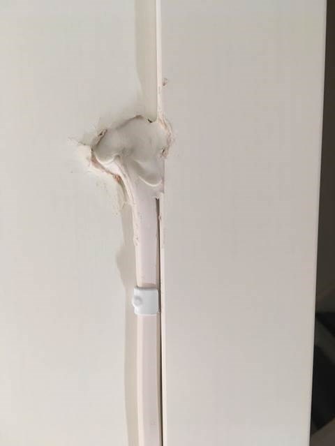 Som dere ser av bildene har de etterlatt bade veggpanel og lister med synlige skader.