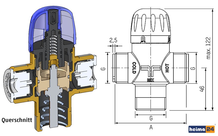 Dette er fra en tysk side og viser hvordan denne blandeventilen (ein Mischventil) er konstruert.
