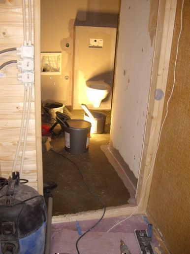 Flislegger har begynt å flislegge. Gulvet er ferdig, og han holder på med veggene. Så det ser ikke ut til at de har tenkt å gjøre noe mer med disse to veggene før de flislegger.