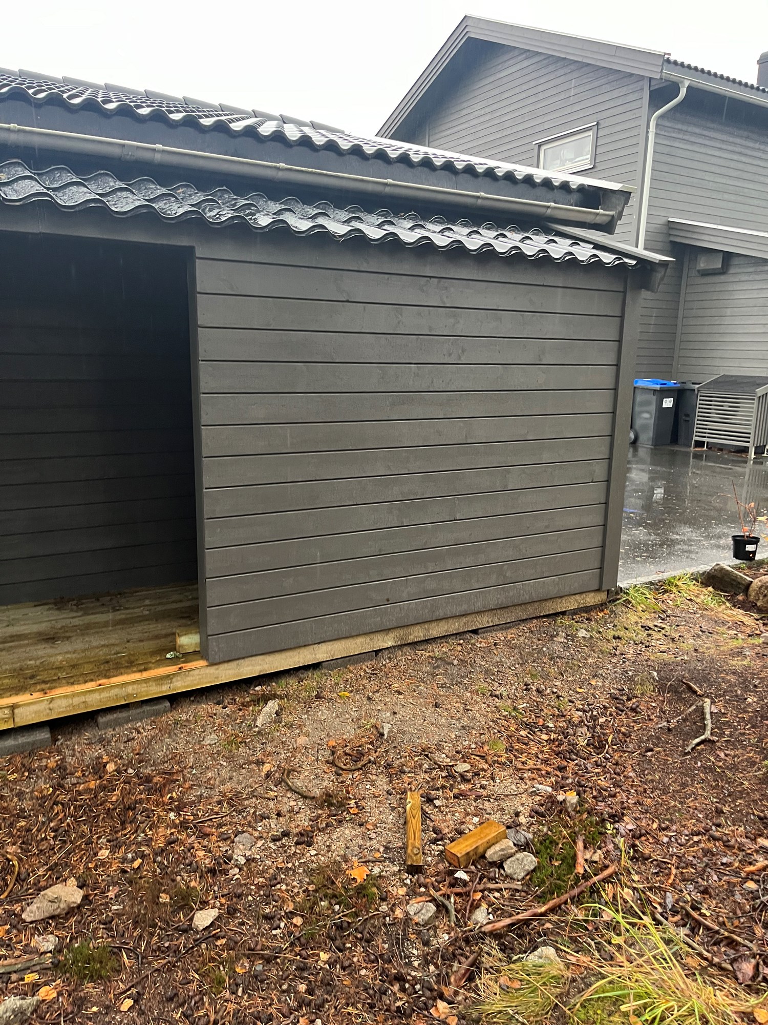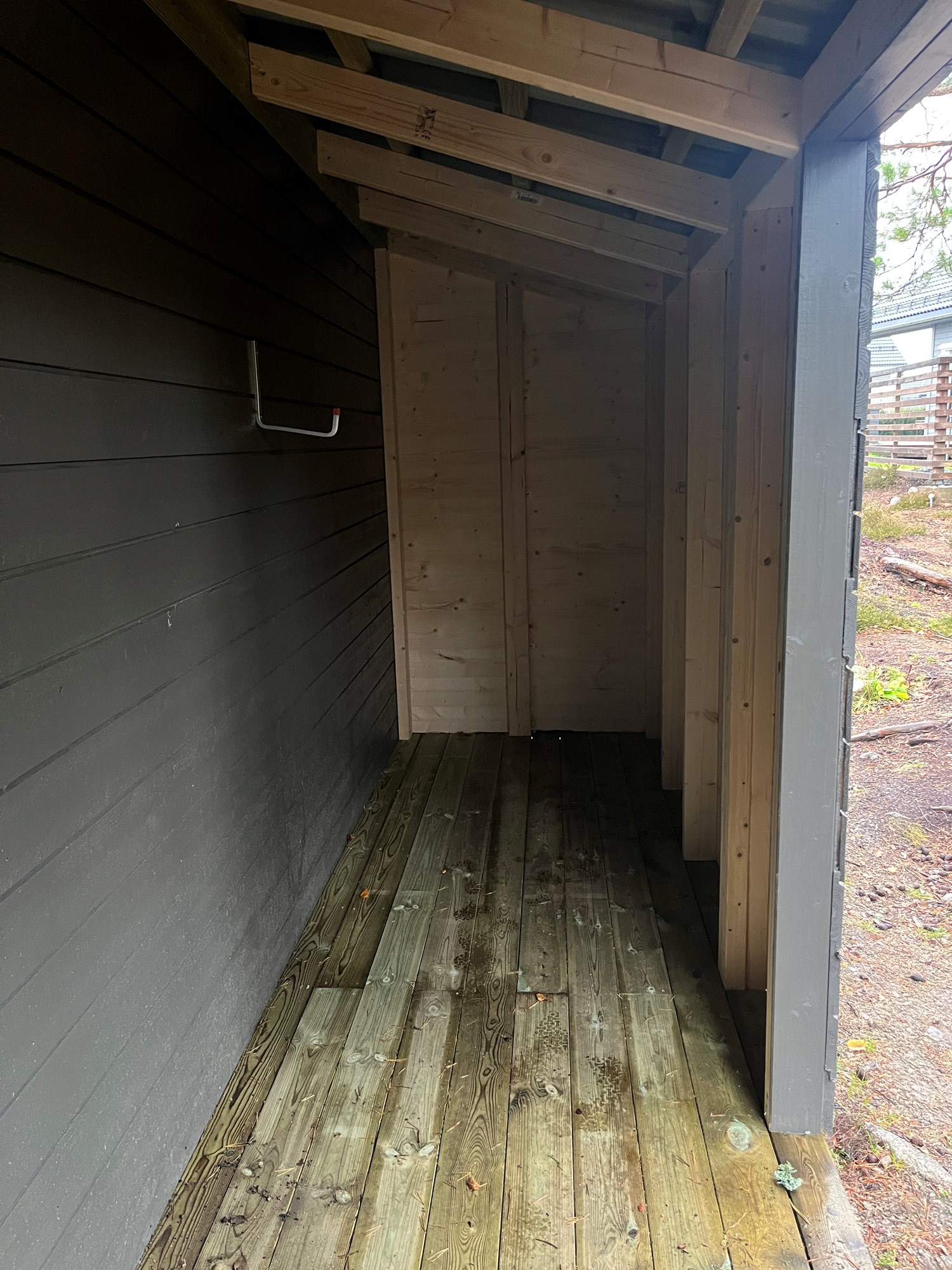 Uteboden er en uisolert bod som er bygg opp av hvit 2x4. Kledningen er montert rett på stenderene og gulvet er av impregnert terrassebord. Takplater av metall skrudd rett på lekter. Dette vil si ingen papp,plast eller isolasjon i vegg eller tak. Bakveggen er inn mot eksisterende garasje, som er isolert med 5cm glava.