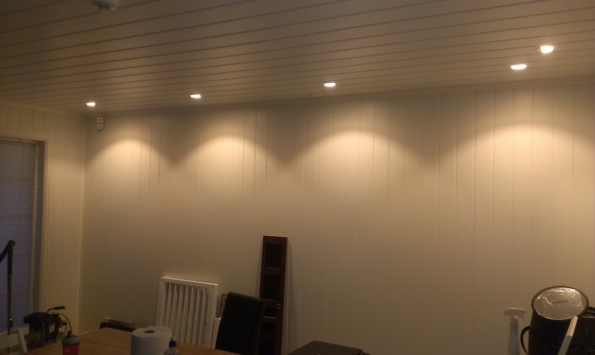 Selve taket er nøytralt hvitt, vedlikeholdsfritt og beregnet å vare fram til jeg havner på gamlehjem eller under torva (sånn et sted mellom 90 og 100, i forhold til hvordan utviklingen er nå og genene i familien - tre av fire besteforeldre ble over 90, to av dem ble 99, og foreldrene mine på drøyt 75 er mer aktive enn før de pensjonerte seg! Farfar ble bare 67, men han var storrøyker), så ønske om å bytte ut lyskildene er ingen faktor! Jeg pusser ikke opp bare for å pusse opp (som halve Norge ser ut til å ha som hobby...).
