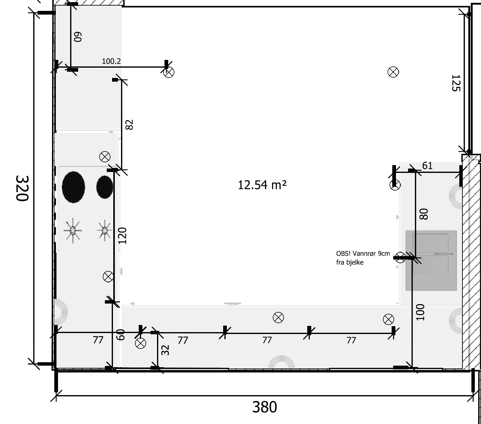 Legger ved tegningen min. Jeg gikk lei av å tegne inn lampepunktene så tenk heller at der de tjukke strekene møtes er lampepunkter. Lampene er nå montert og vi synes lyset ble veldig bra. Vil aldri ha behov for maks belysning på disse. Det eneste jeg angrer litt på er nede i venstre hjørne. Der ble det litt for tett. Her ville jeg heller hatt tre downlights langs 380-veggen (litt som du har på den øverste tegningen din).