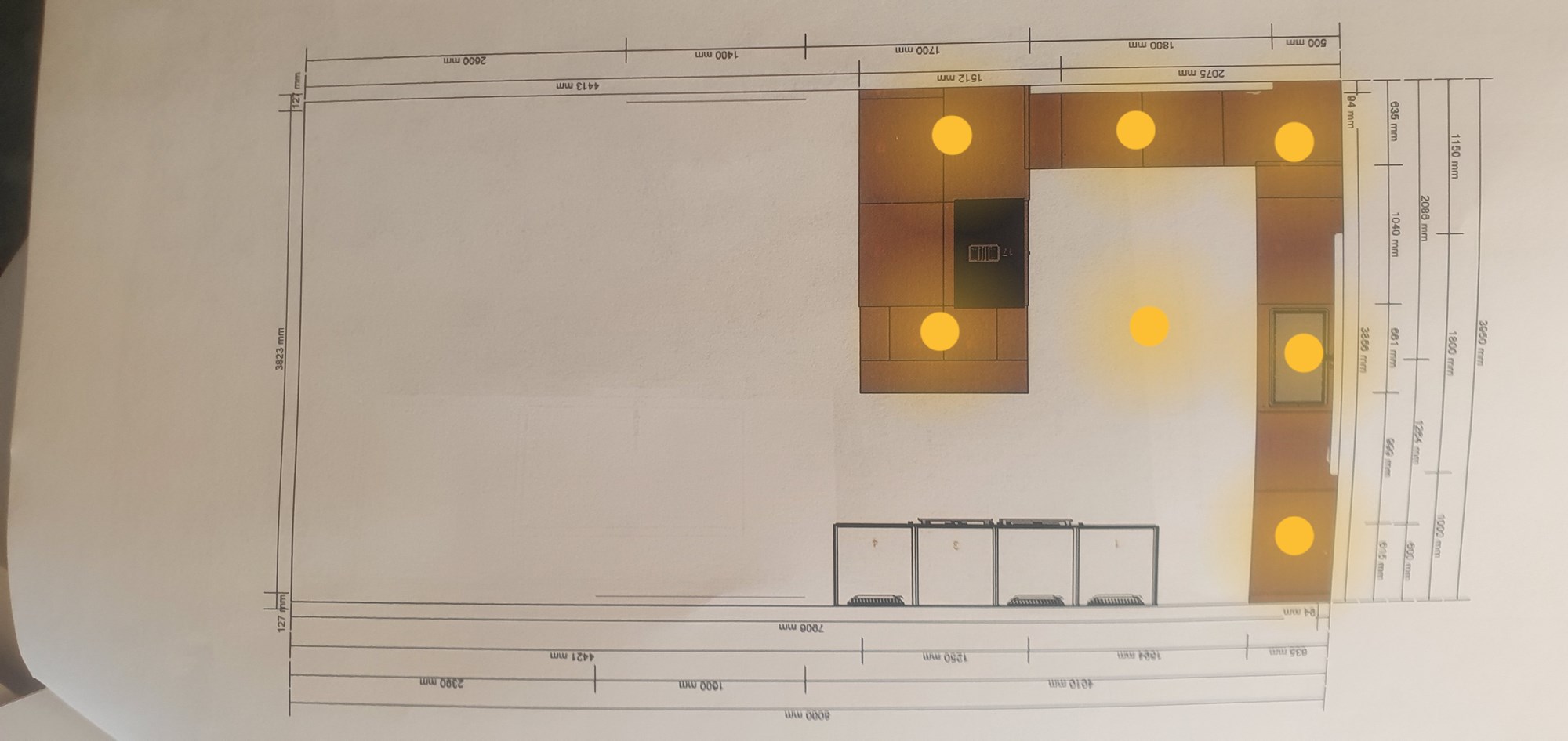 En ting til jeg ville vurdert er å kanskje trekke den ene downlighten på halvøya litt lenger inn og montert to downlights som lyser opp høyskapene. På tegningen min er det to høyskap mot toppen av bildet og her er det montert en downlight midt mellom disse, 40cm ut. Dette synes vi var et godt valg. Siden du har fire tenker jeg to ville gjort susen.