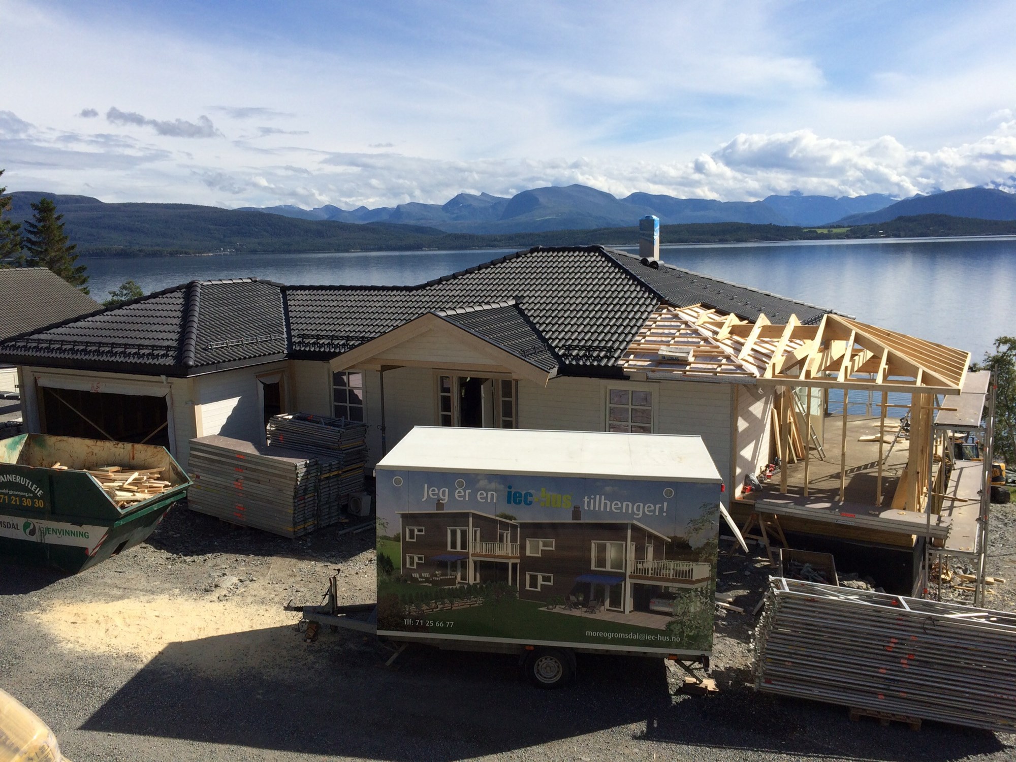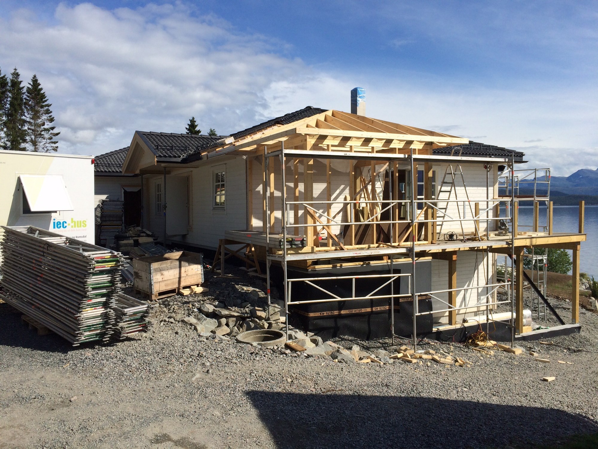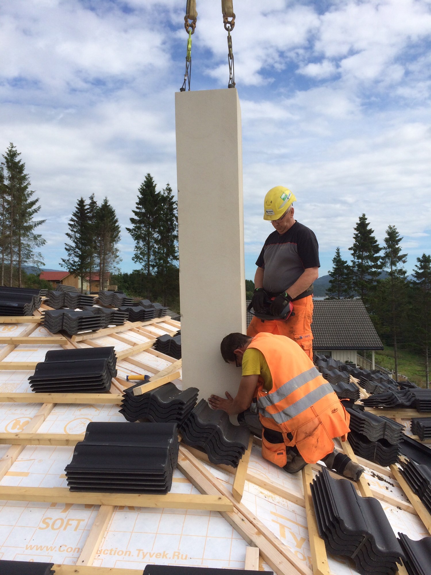 Takstein blir lagt på hele huset av IEC hus, også på terasseoverbygg. Reisverk og tak konstruksjon lager vi selv.