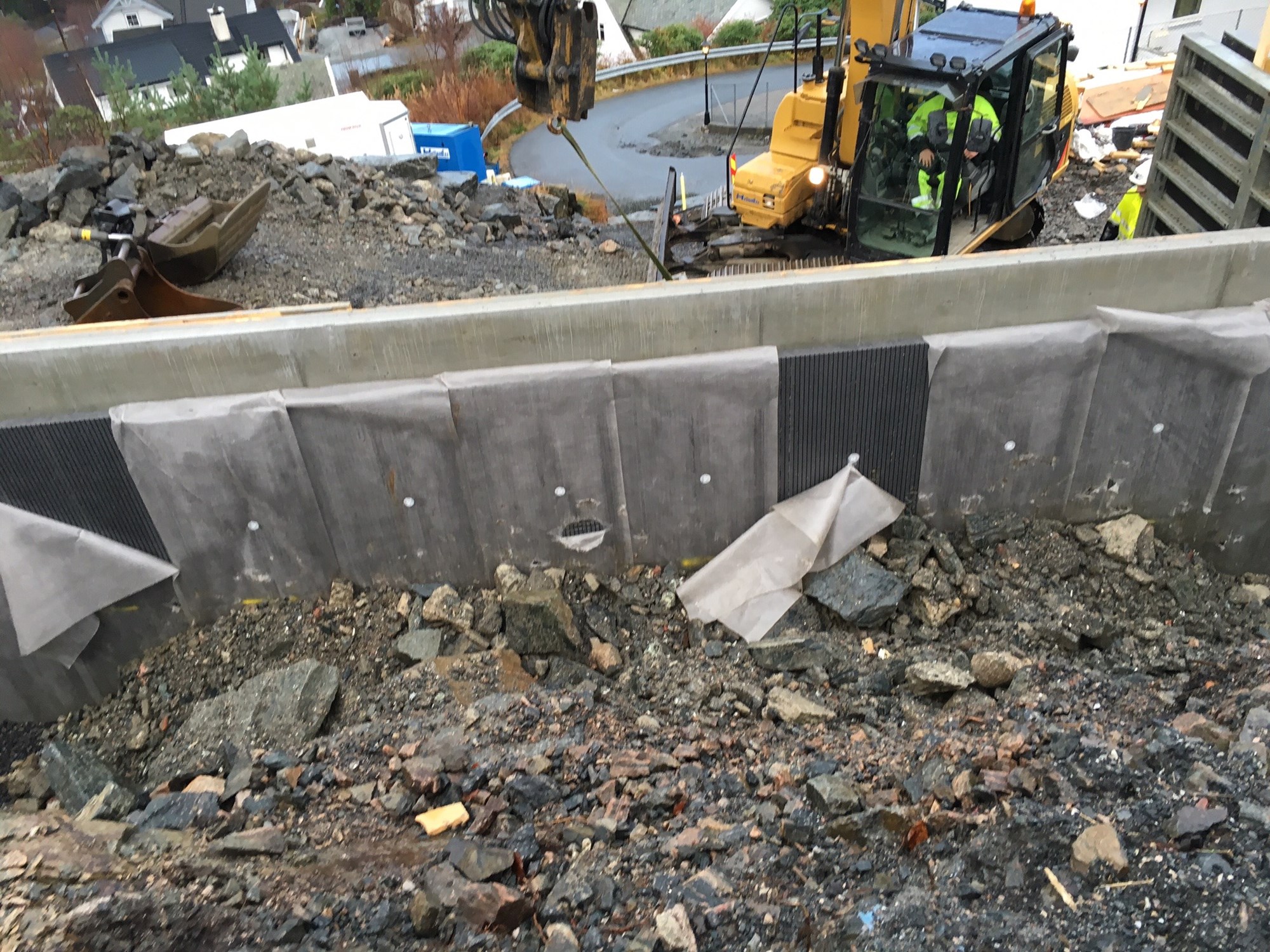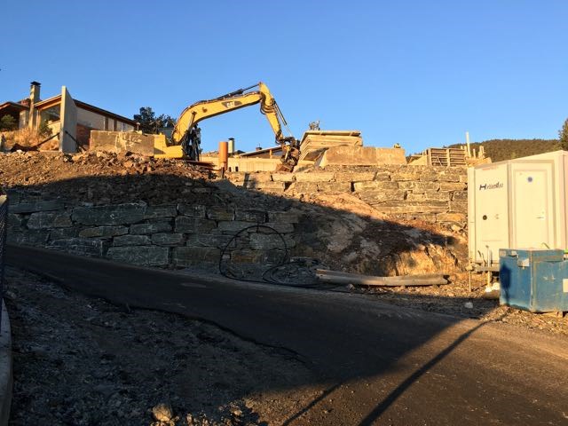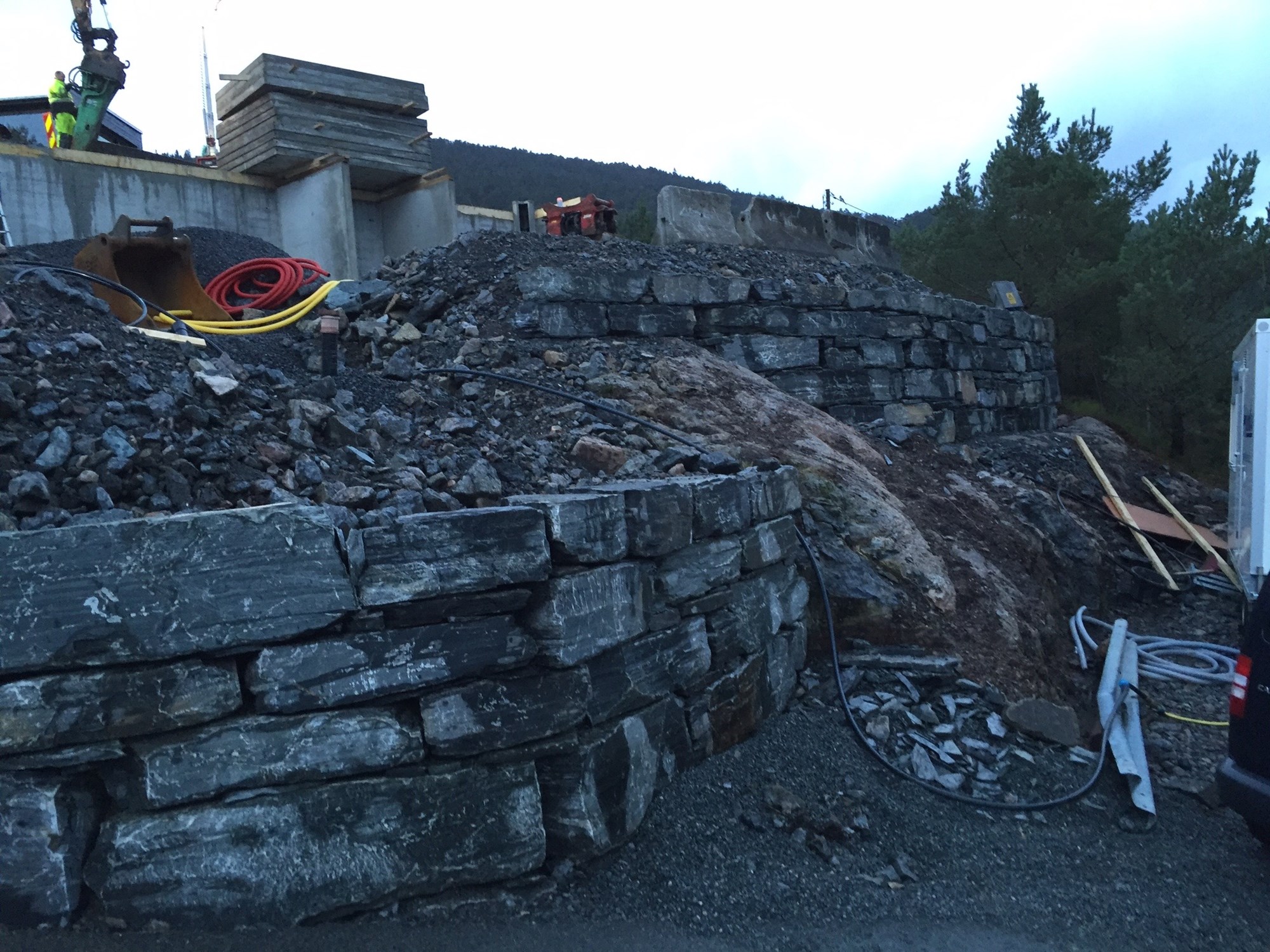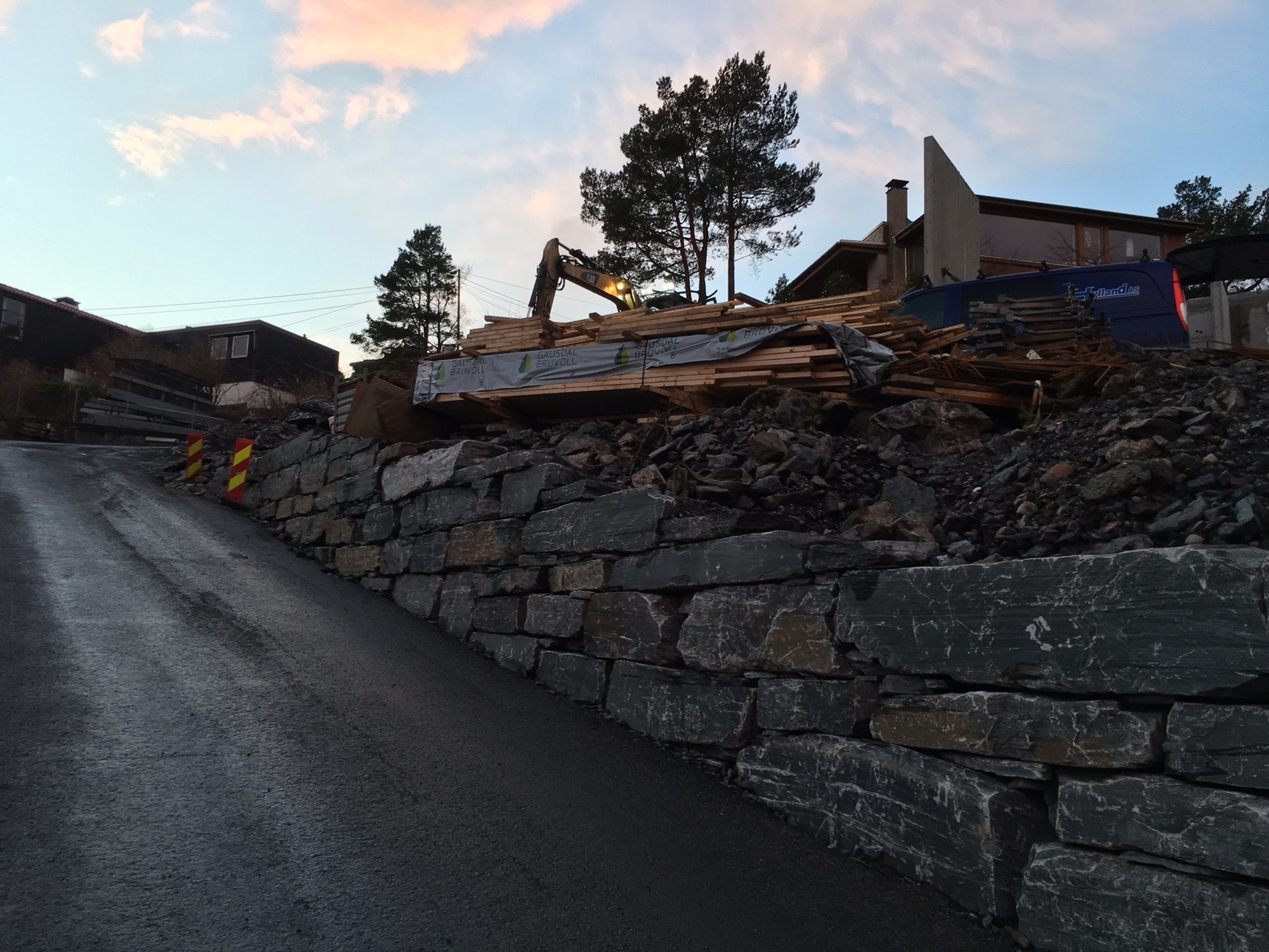 Støttemur i naturstein er nå ferdigstilt og vi er i gang med betongmurer ifbm terrasser.
