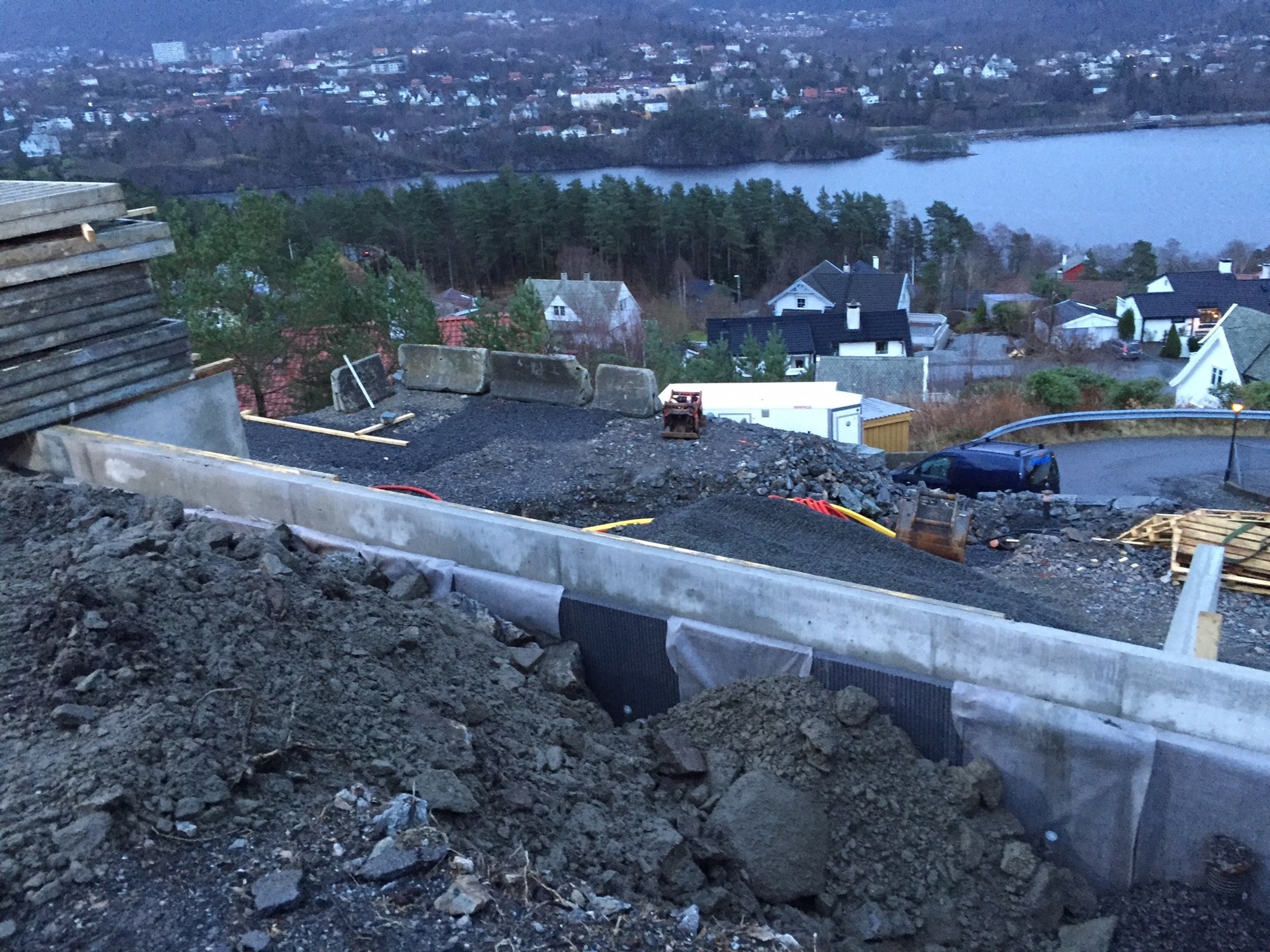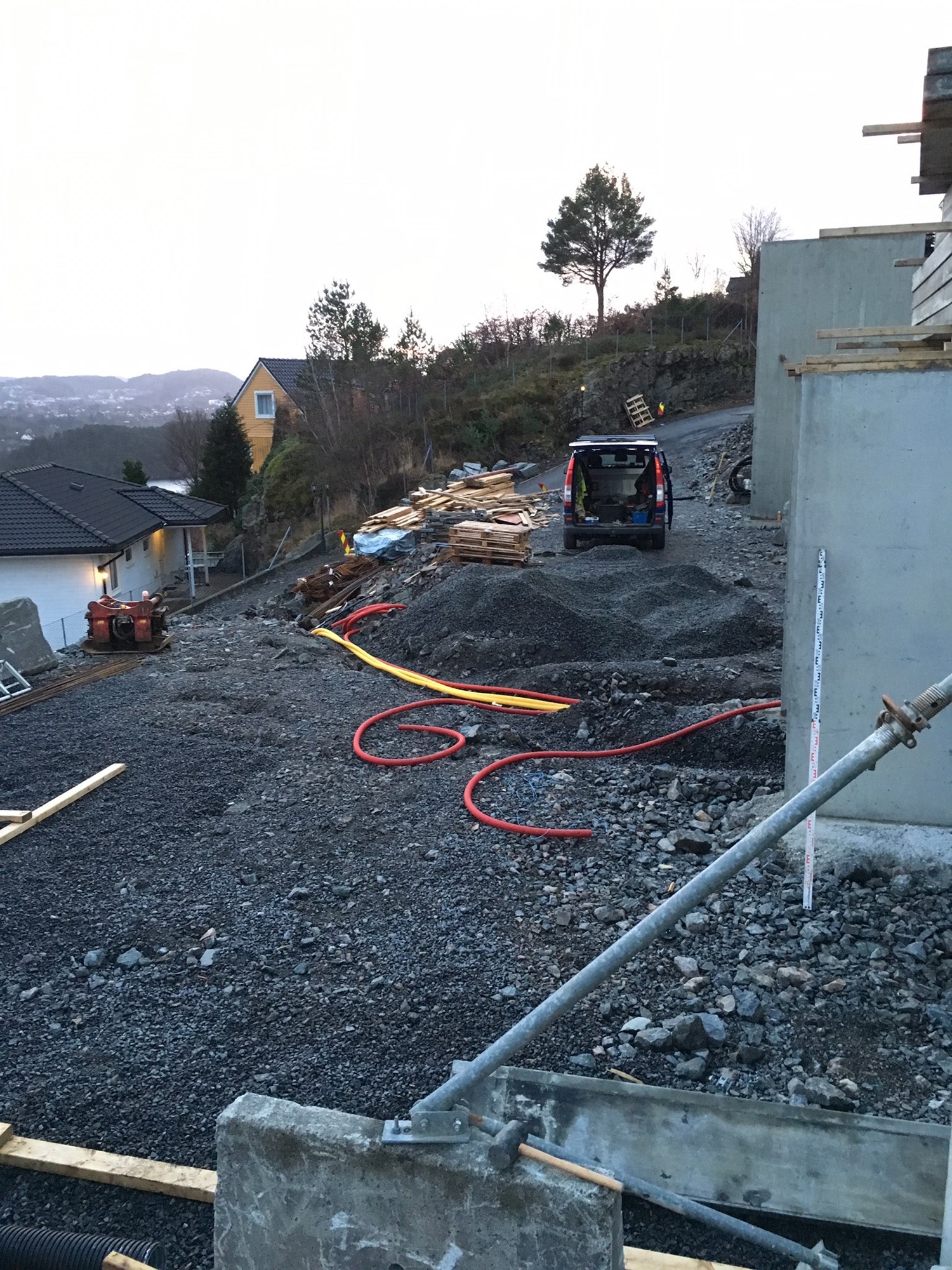 En liten oppdatering. Støttemur i naturstein er nå ferdigstilt og vi er i gang med betongmurer ifbm terrasser. Rørlegger er i gang med bunnledning og elektrikker har lagt inn trekkerør . Det er helt vanvittig mye å ta stilling til og jobben som byggeleder for en som ikke har bygget før er meget tidkrevende og til tider enormt frustrerende. Men alt i alt er det kjekt å ta så stor del i alt som skjer.