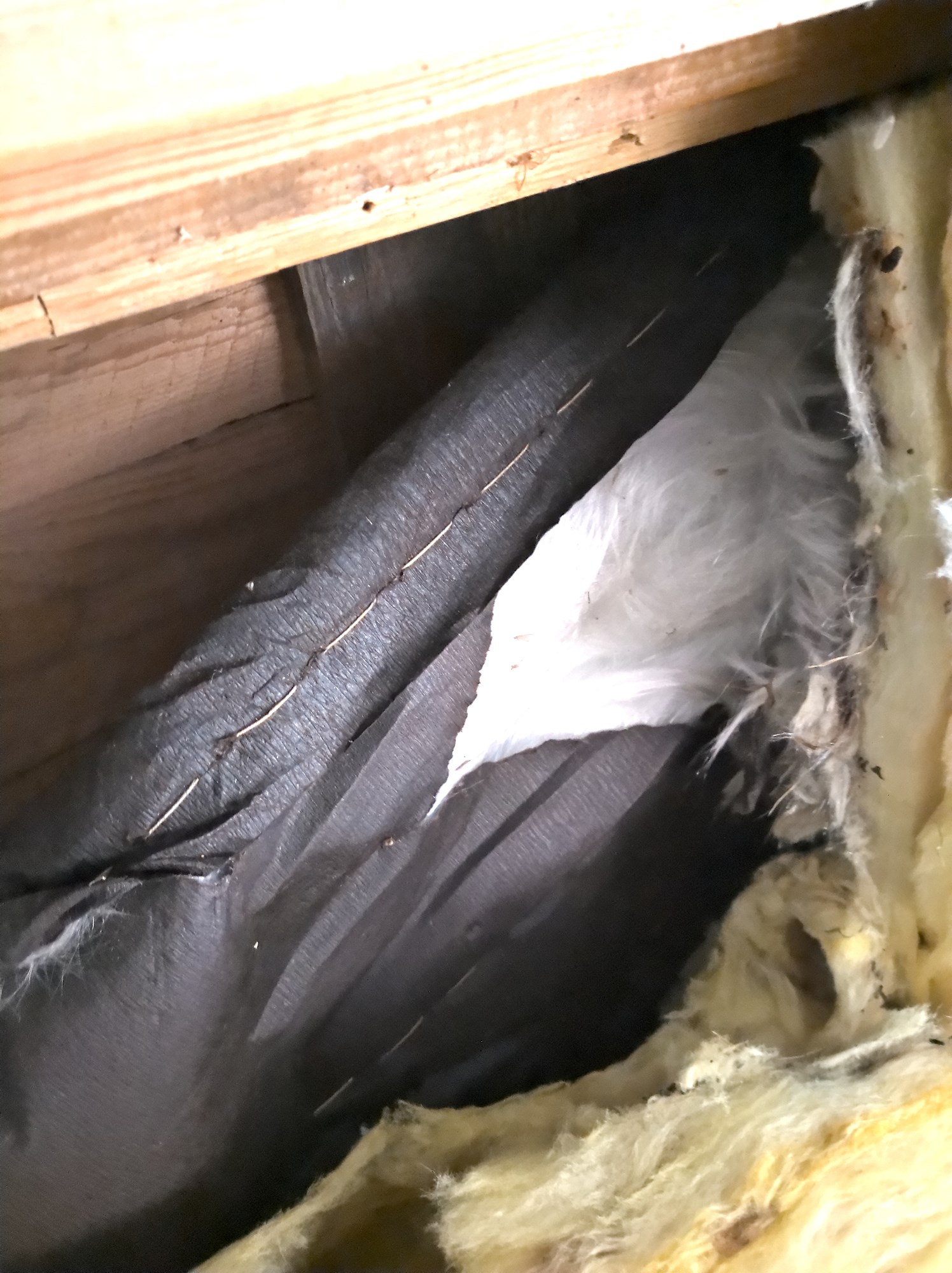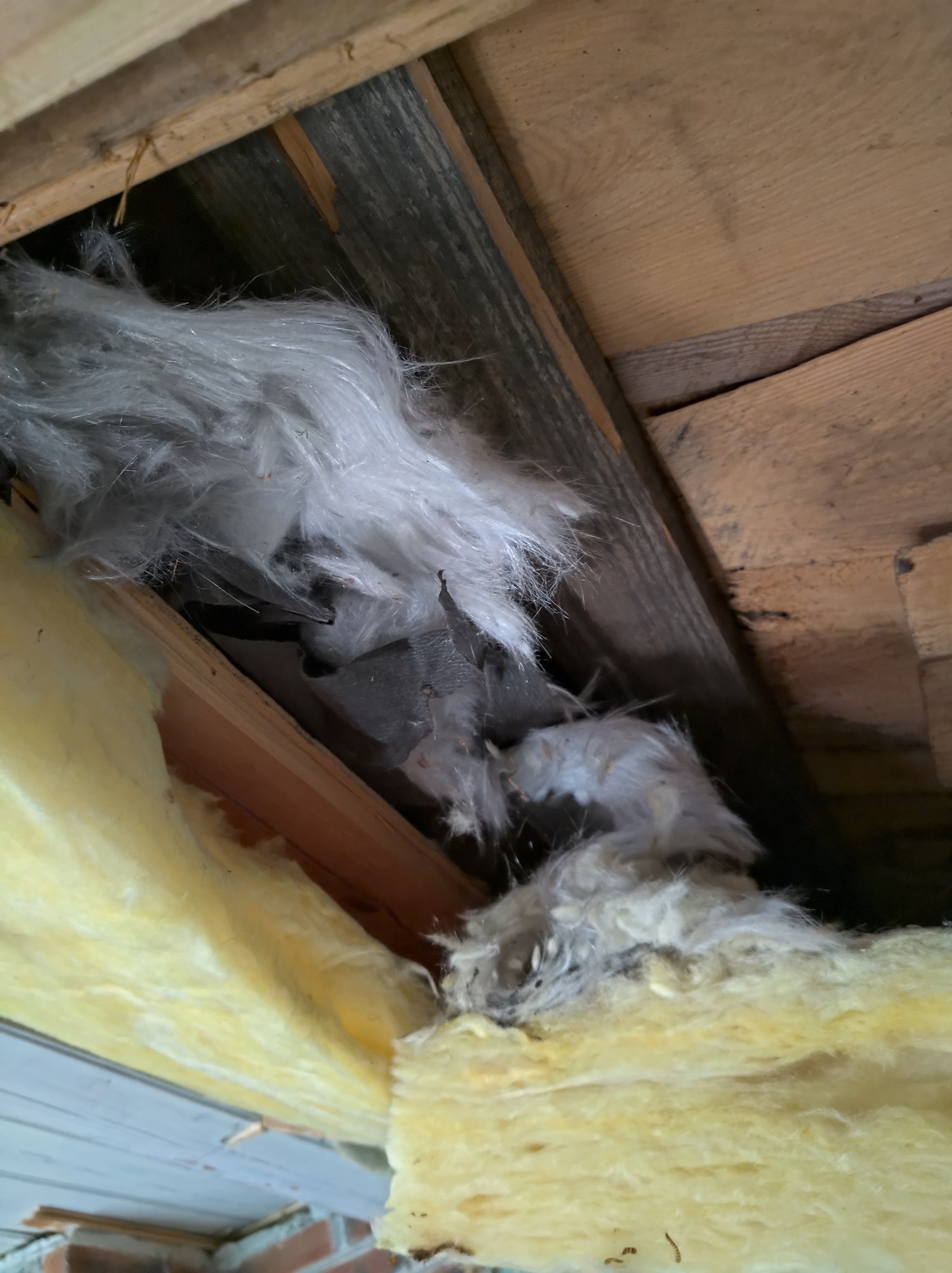 Vi renoverer et hus fra 1916, som sist ble renovert og etterisolert i 1976. Over glava/glassvatt i skråtaket, opp mot gammelt undertak, fant jeg noen matter som er delvis åpnet og inneholder isolasjon bestående av hvite lange fibre. Kan dette inneholde asbest? Det fremstår som at de har brukt noe de hadde liggende i tillegg til glava. Se vedlagt bilder.
