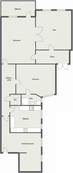 Legger ved plantegning av leiligheten. Hovedendringen er å legge soverommene på rad innerst (nederst) i leiligheten, så utvide badet, og å legge kjøkkenet der hvor det ene (øverste) soverommet er i dag, samt å åpne opp fra det nye kjøkkenet og inn til stuen til venstre dersom det er mulig.
