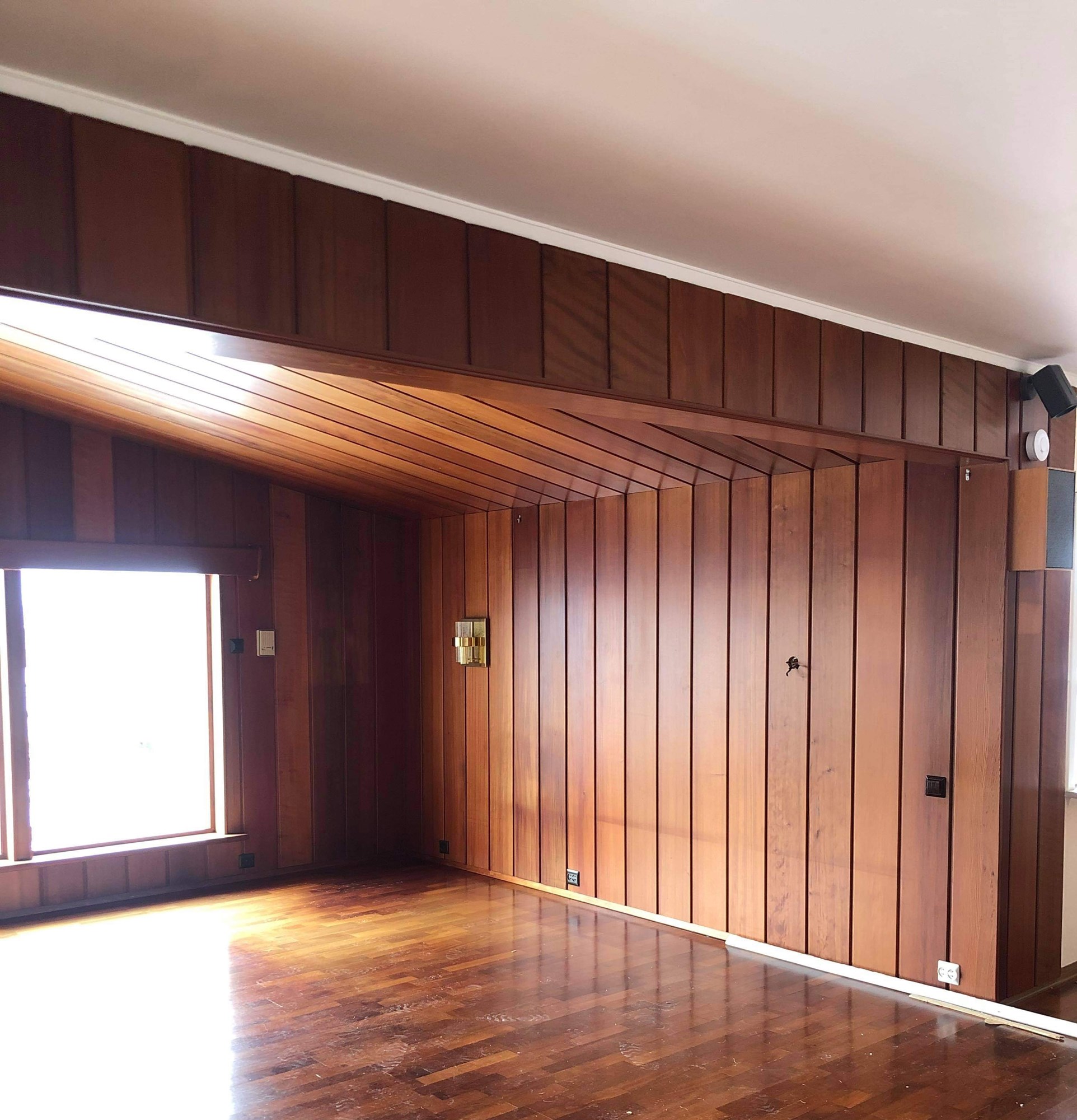 I det ene rommet er det redwood på vegger og tak - ganske kult, så vi ønsker å beholde dette. Men det har falmet en del på 70 år og trenger en behandling. Det er heltre og ganske mye lakket.