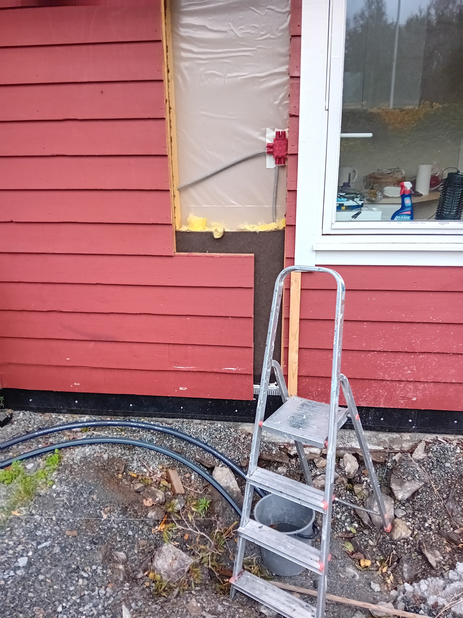 I forbindelse med ombygging av kjøkken/asfaltering av vei osv. så har vi fått nytt inntaksrør for vatn. Denne kommer opp der det i fremtiden skal bli vaskerom/teknisk rom, men dette ligger 5 år frem i tid. For å fjerne det gamle inntaksrøret som kommer midt opp på stuegulvet skal vi nå sette inn nytt fordelerskap i yttervegg, med plass til vannmåler, flere kurser og vannstopp ventil. Frå dette skapet går det da rør til det gamle fordelingskapet.  På sikt vil ytterveggen bli innervegg på vaskerommet, men frem til da må vi hindre at vatnet fryser.
