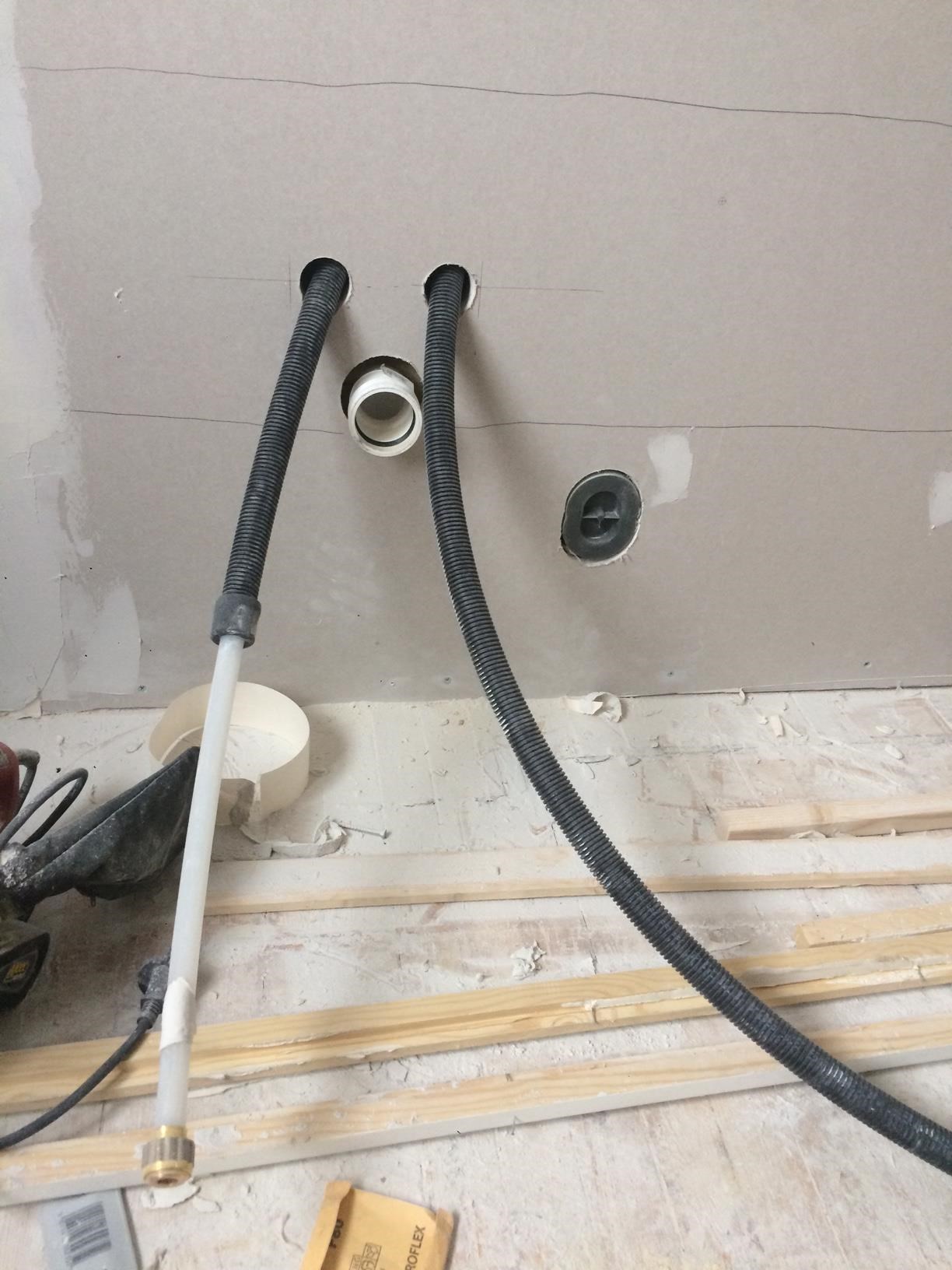 Jeg stusser over en slik løsning og mener at en naturlig avslutning vil være å legge disse rørene i veggboks slik at det er enkelt å koble til kjøkkenkran og oppvaskmaskin når den tid kommer.