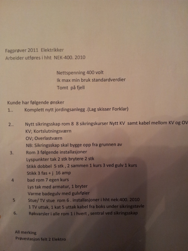 Ellers liker sensor å høre hva kunden liker, og "etter ønske fra kunde" forutsetninger slikt som plassering av utstyr eller tilkobling av tvilsomme laster. Min fagprøve lignet veldig, vi fikk også en garasje i tillegg. Noen valgte å kjøre en stigeledning for mulig kåk i 2.etg. og verksted i garasjen. Jeg valgte en enkel 16 A treg kurs, med ekstra rør ut fra skal for mulig utvidelser. Så lange man viser sensor at man har tenkt over konsekvensene for sine valg, løser det meste seg.