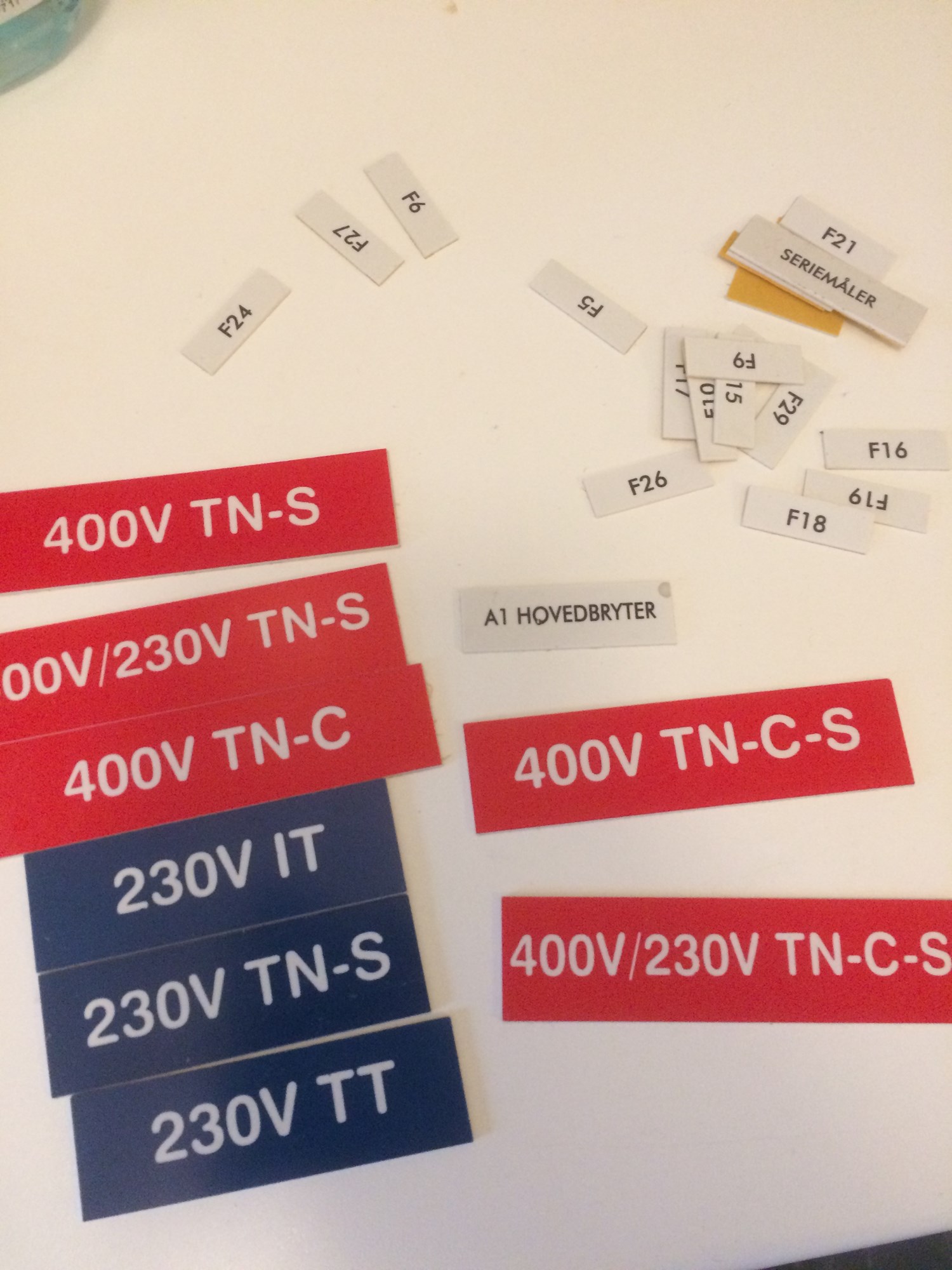 Alle sikringer skal merkes med nummer F1 - F2 - F3 osv. Skap skal merkes med blått eller rødt meke med spenningsnivå og nettsystem avhengig av hva du har. Bare elektriker som har vært slapp her.