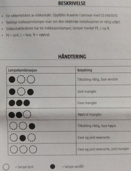 Men nei, på de tre stikkene jeg satte det i, så viste det at fase og jord er reverserte, og jord mangler.