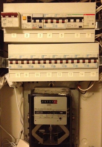 I huset vårt kommer strømmen inn via luftstrekk i 2. etg. Der sitter det 3 stk 63amp sikringer. Derfra går inntaksledningen til sikringsskapet vårt i 1 etg der det fordeles til 12 kurser (eldre hus dette). Fra vårt skap går det videre til et skap i en hybel vi leier ut, her er det 7 kurser.