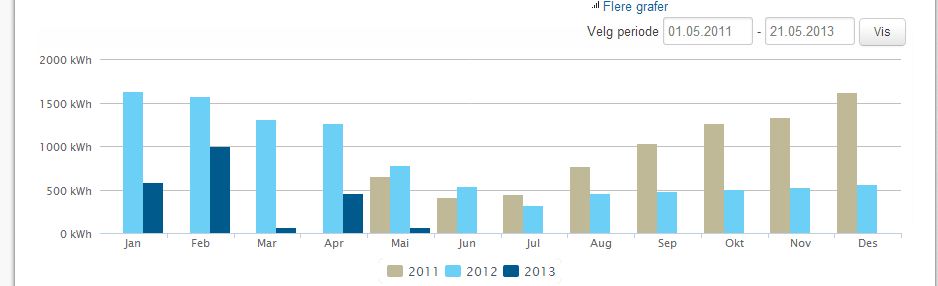 Har lagt ved en skjermdump av forbruk 2011 og 2013. som viser konstant forbruk fra August 2012. på ca 550kw pr mnd siden. Forbruk tidligere er ca 3 ganger det!