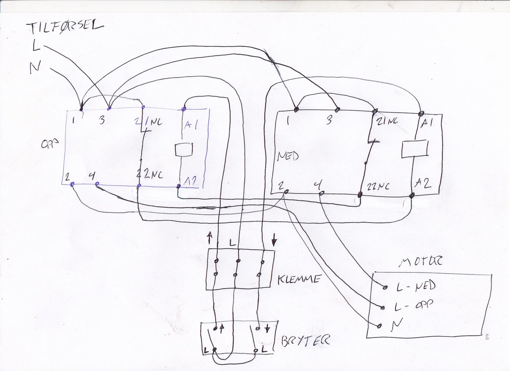 For å utdype litt: styrestrømmen til "opp"-kontaktoren går fra L, gjennom bryteren, til A1 på spolen, videre fra A2 til det brytende kontaktparet 21/22 på "ned"-kontaktoren før den til slutt går til N og slutter kretsen. Om "ned" aktiveres, så blir altså styrestrømskretsen for "opp" samtidig brutt, og omvendt.