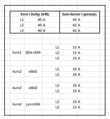 Hmm, 3x16A går kanskje ikke likevel siden elbilene har samtidighetsfaktor på 1.0? Da må den siste kursen ha faktor på <0.5 om det skal gå?