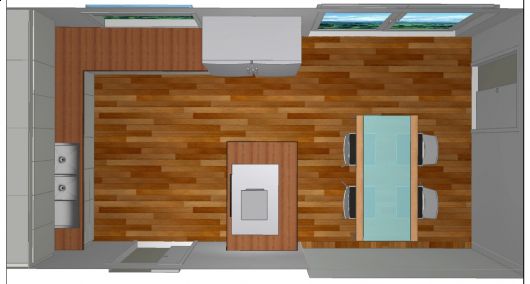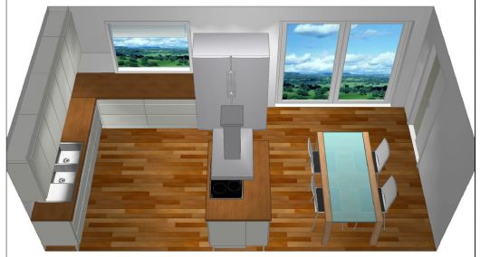 Det er nytt kjøkken på gang. Det blir fint og flott, se vedlegg (for referansens skyld er rommet er ganske nøyaktig 3x6 meter og i "nedre ende" av kjøkkenbordet er det fullhøyde vinduer mot gangen (jepp, han som tegnet huset en gang på 60-tallet hadde nok røyket mer enn gjennomsnittet...)).