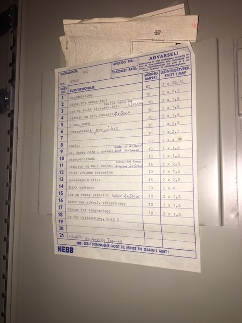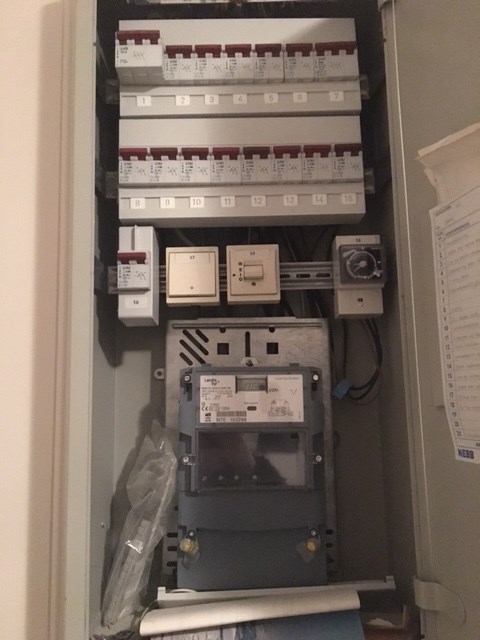 Syntes også det er merkelig at det ikke er en jordfeilbryter såvidt jeg ser utifra bildene jeg tok. Virker som 16 er en ringetrafo? og 17 er et eller annet. Av og på bryter for ringeklokke.