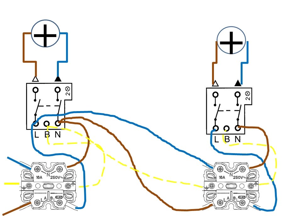 Her bør N være blå hele veien. Du snur og vender på fargene. Jord behøver du ikke til bryterne. B er B-lindklemme, bare et skjøtepunkt ved behov. Koblingsbokser trenger du ikke, all kobling kan skje i brytere eller kontakter i dette tilfellet.