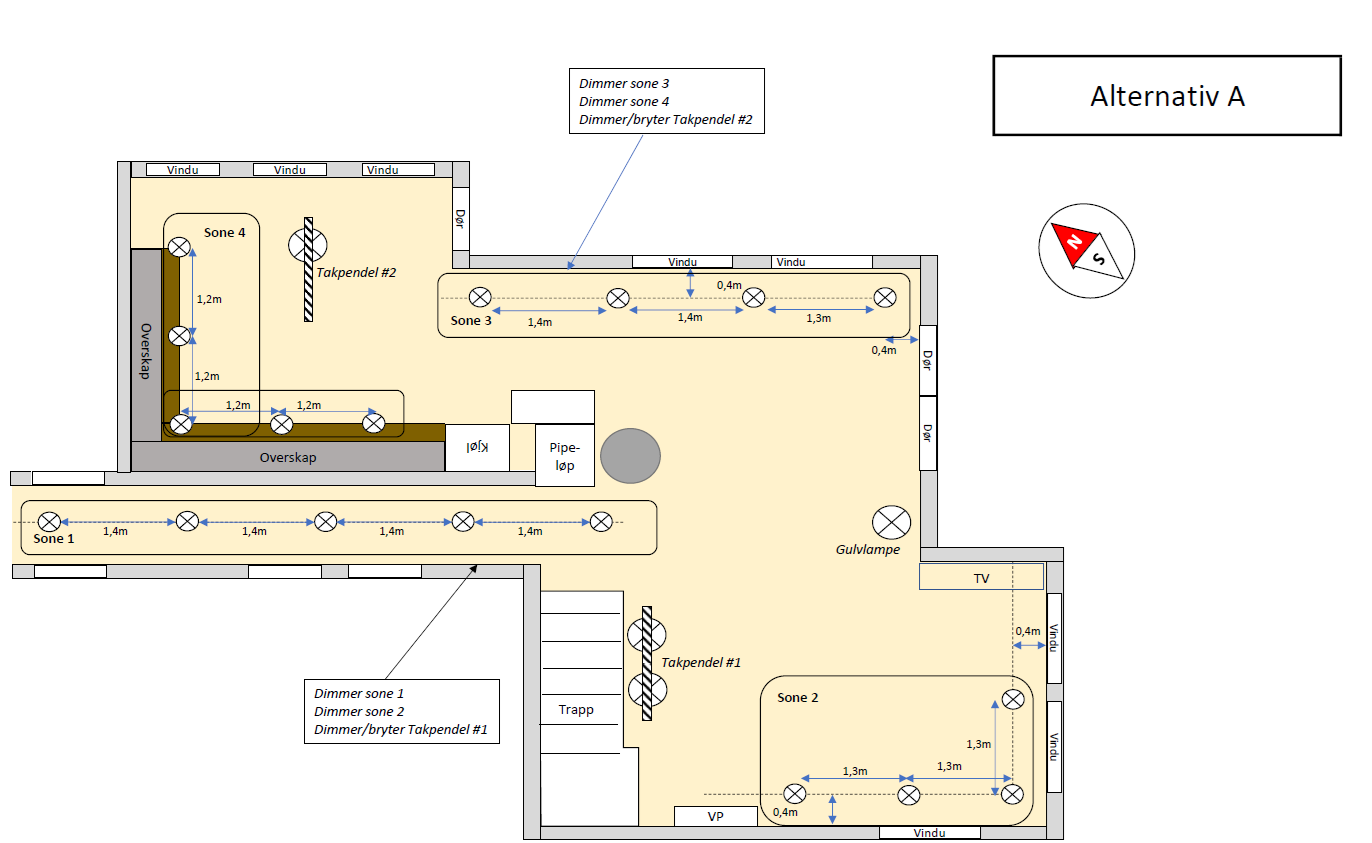 Vi ser for oss 4 soner med downlights tilkoblet hver sin dimmer, samt to takpendler tilkoblet hver sin bryter/dimmer.