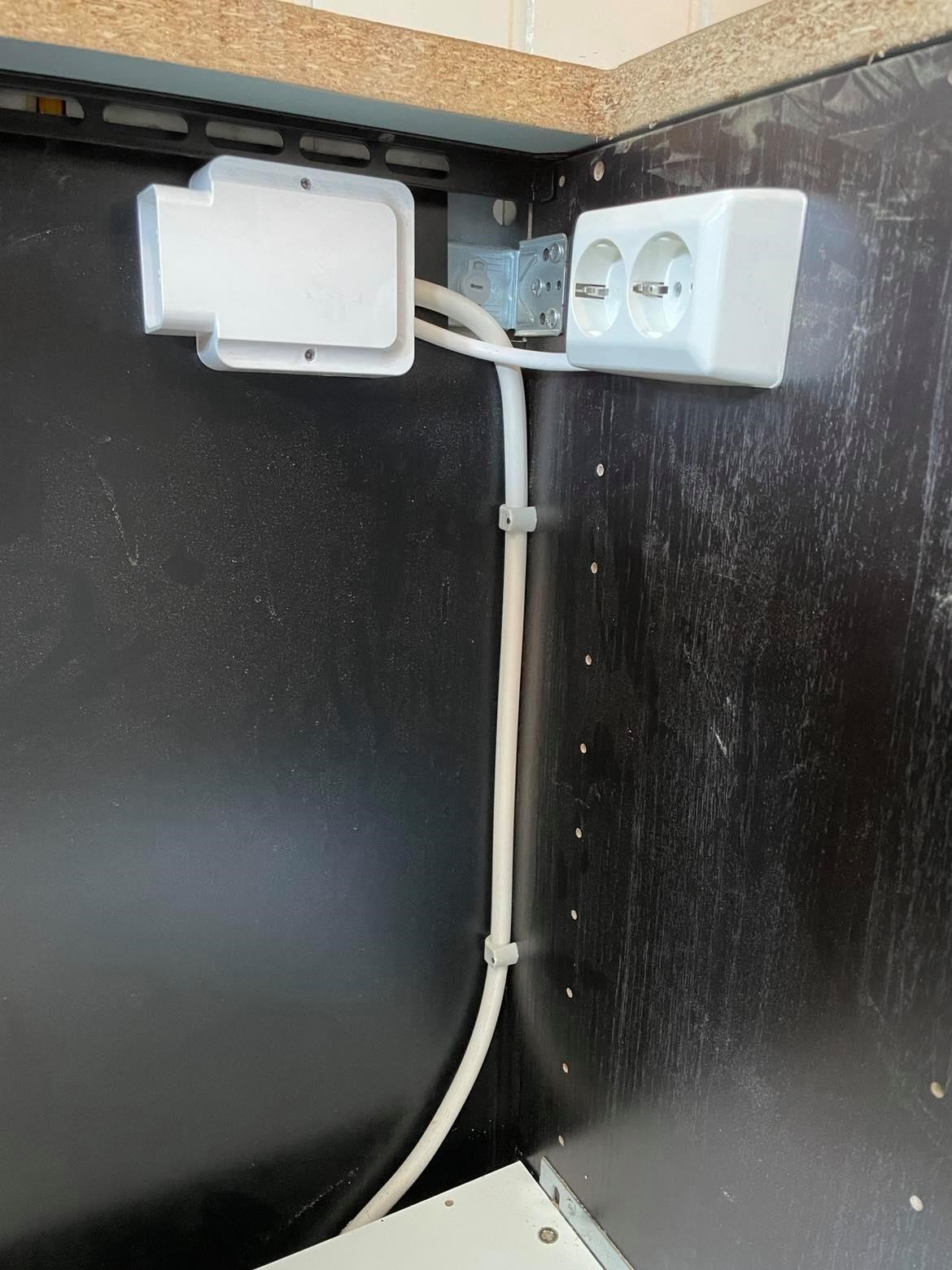 Legger ved et bilde her som jeg tok når jeg tok ut stekeovnen og platetoppen. Kontakt-saken til venstre er til platetoppen, og som du ser på bildet leder den strøm videre til stikkontakten til høyre som ovnen kobles i.