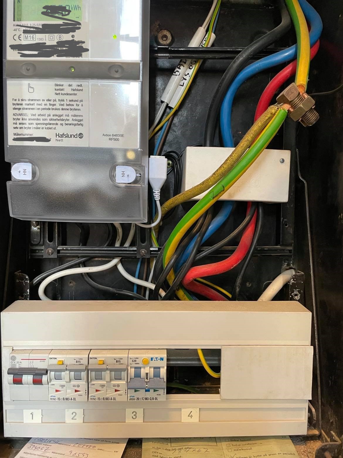 man ser også den hvite runde kabelen komme inn nede til høyre i sikringsskapet
