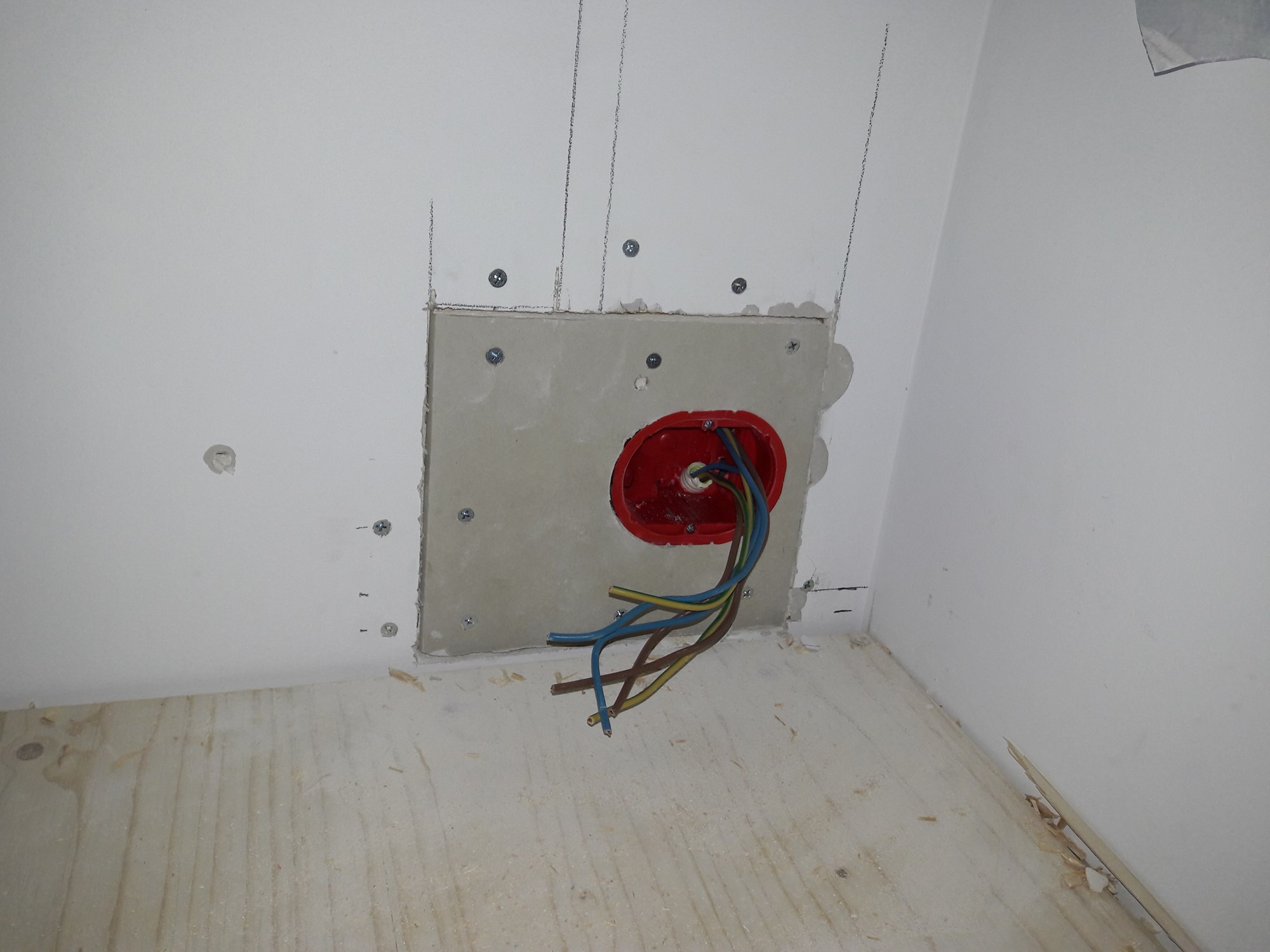 Hvis det er sparklet og ferdig overflatebehandlet så ville jeg tatt Feinsaga og saget istykker boksen så mye at jeg hadde fått den ut gjennom hullet. Så frest opp med malen og puttet inn oransje 1,5 multiboks fra Elko. Den røde er noe brask. Burde ta max 10 minutter pr hull.