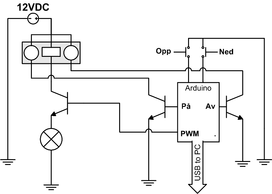 Mine dimbare lyspunkter er styrt av en Arduino. LED-lys styres ved å slå dem av og på med høy "blinkefrekvens" (noen hundre blink i sekundet eller mer). Lysstyrken bestemmes av hvor langt blinket er i forhold til tiden mellom hvert blink. I skissen nedenfor styrer en pulsbredde-utgang (PWM - Pulse Width Modulation) på Arduinoen en svitsje-transistor for spenning til lyspunktet. Transistoren bør stå nær lyspunktet, ikke nær Arduinoen: All strøm til lyset går gjennom den; styrestrømmen på PWM-utgangen er minimal og kabellengden betyr lite.