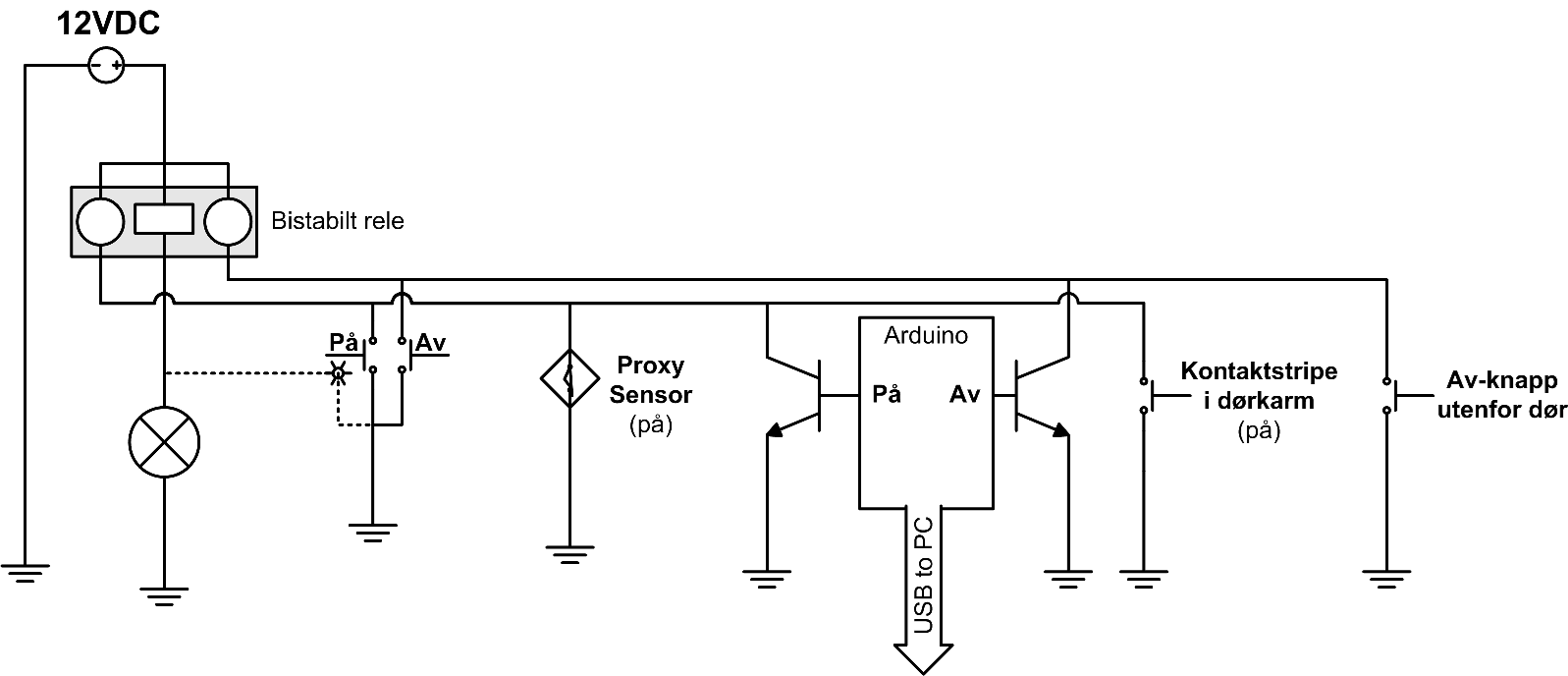 Først trappebryteren, eller "multi-bryter": Her er vist en prinsippskisse med én trappebryter, en proxy-sensor som kun slår på lyset, en mikromaskin (Arduino) som f.eks. kan være programmert til å slå på/av lyset på ulike klokkeslett, en mikrobryter som slår på lyset når åpning av døra gjør at en forbindelse i dørkarmen sluttes, og til slutt en trykknapp for å slå av lyset når man forlater huset. Det vil neppe være noe lyspunkt med alle disse på/av-typene - skissen er laget for å illustrere ulike alternatvier for å koble enten på- eller av-lederen mot jord, og at du kan ha så mange og så ulike skom du ønsker.
