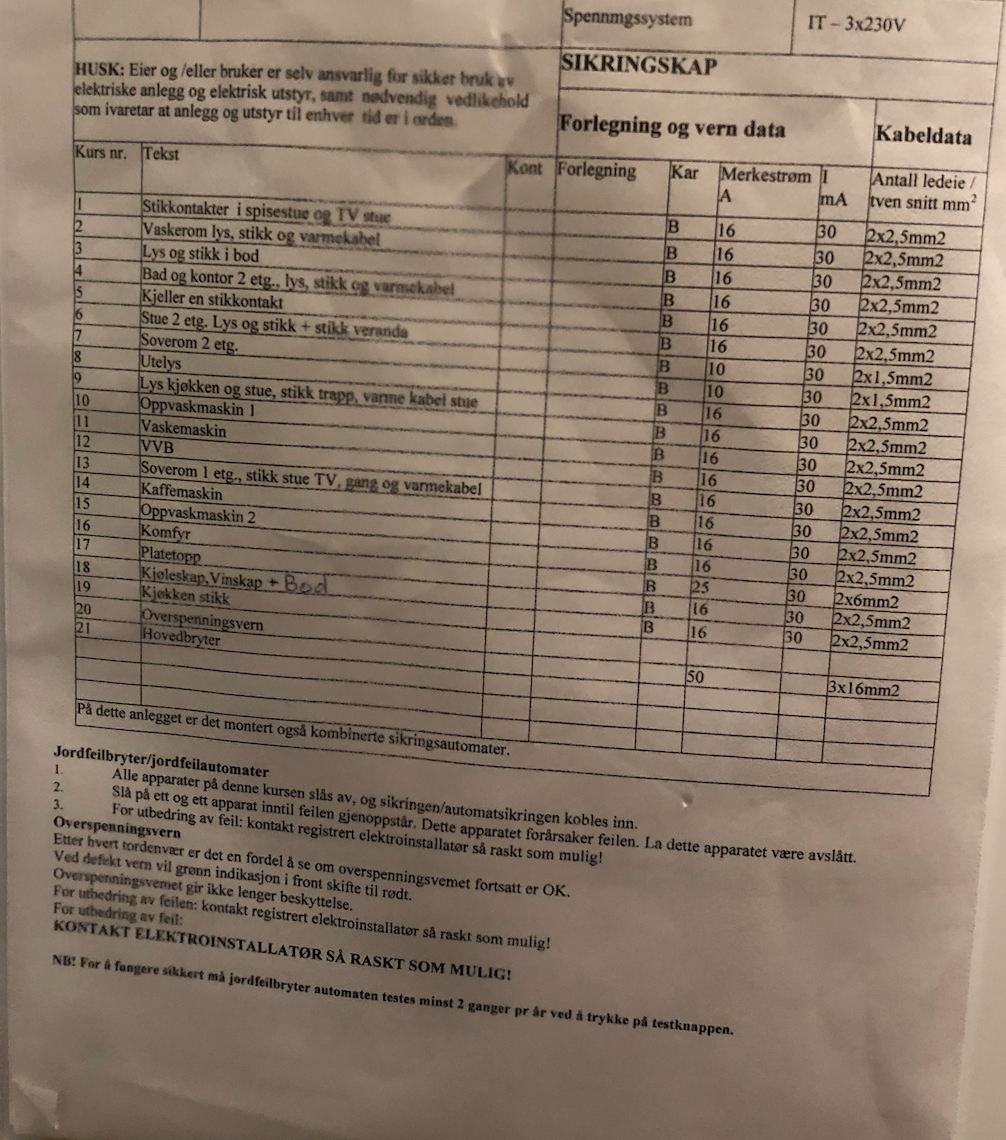 Har tatt bilde av denne oversikten. Over bildet på arket er det huket av på FEL NEK400 2016 om jeg ikke tar feil. Vi har også nettopp fått installert AMS-måler. Byggeår 1960, men så og si totalrenovert i 2014. Også større renoveringer i 2004.
