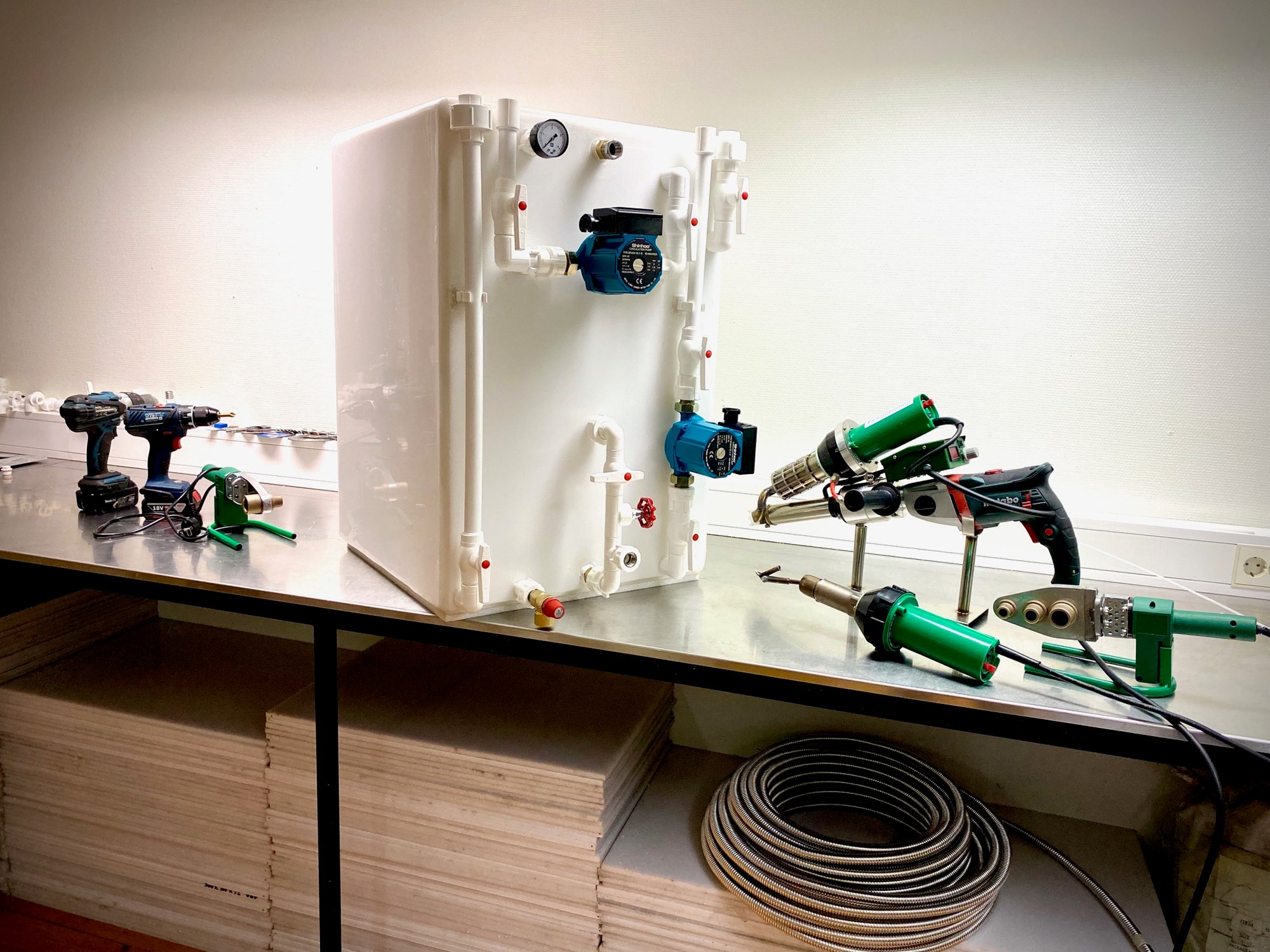 Det første var overgangen til PP rør og fittings, "bedre" enn metall og mye lavere pris. I tillegg langt enklere og raskere å jobbe med. Fusjons-sveising av rør og fittings er så enkelt at jeg kunne lært min mor på 80 å gjøre det i løpet av en halvtime. Enhver med et minimum av ferdigheter vil klare å sette sammen dette selv, uten problemer.
