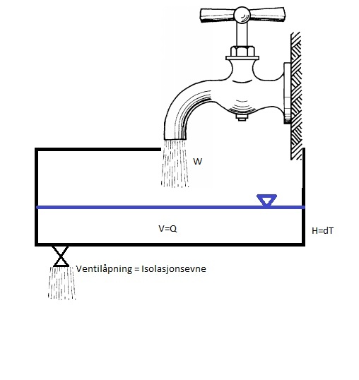 Modell: Jeg ser for meg en vanntett kasse. I bunnen sitter en justerbar ventil. Når kassen er tom er det ingen forskjell mellom kassen og det utenfor. Var kassen et hus var det da samme temperatur inne som ute. Så vil jeg ha vann i kassen, eller om det er et hus, øke temperaturen inne i forhold til ute. Ventilens åpning illustrerer isolasjonsevnen, og boksens areal hvor mye varme huset kan holde på (Magasinere) i vegger og tak. Stort areal, "murhus", lite areal så og si ren "glava" i vegger og tak. Jo varmere jeg vil ha det jo høyere blir vannstanden. Med stigende vannstand øker trykket ved bunnen og ventilen, og mer vann strømmer ut jo høyere jeg får vannstanden.