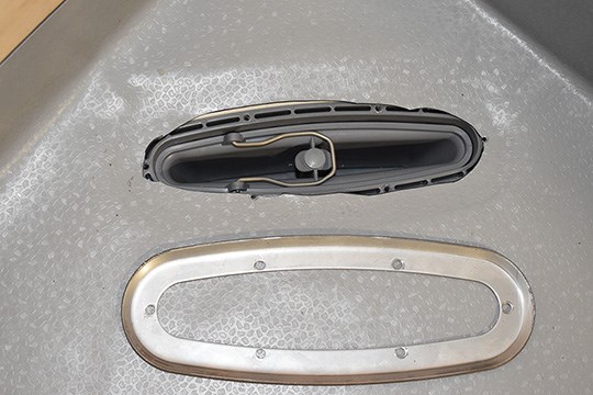 Å legge en lapp over den gamle membranen gikk greit, men det ble skivebom når han skulle finne skruehullet gjennom to membraner (1,5 mm x2 = 3 mm). Jeg fikk nesten nervesammenbrudd, når skruene stod halveis nedskrudd 45grader i sluket...