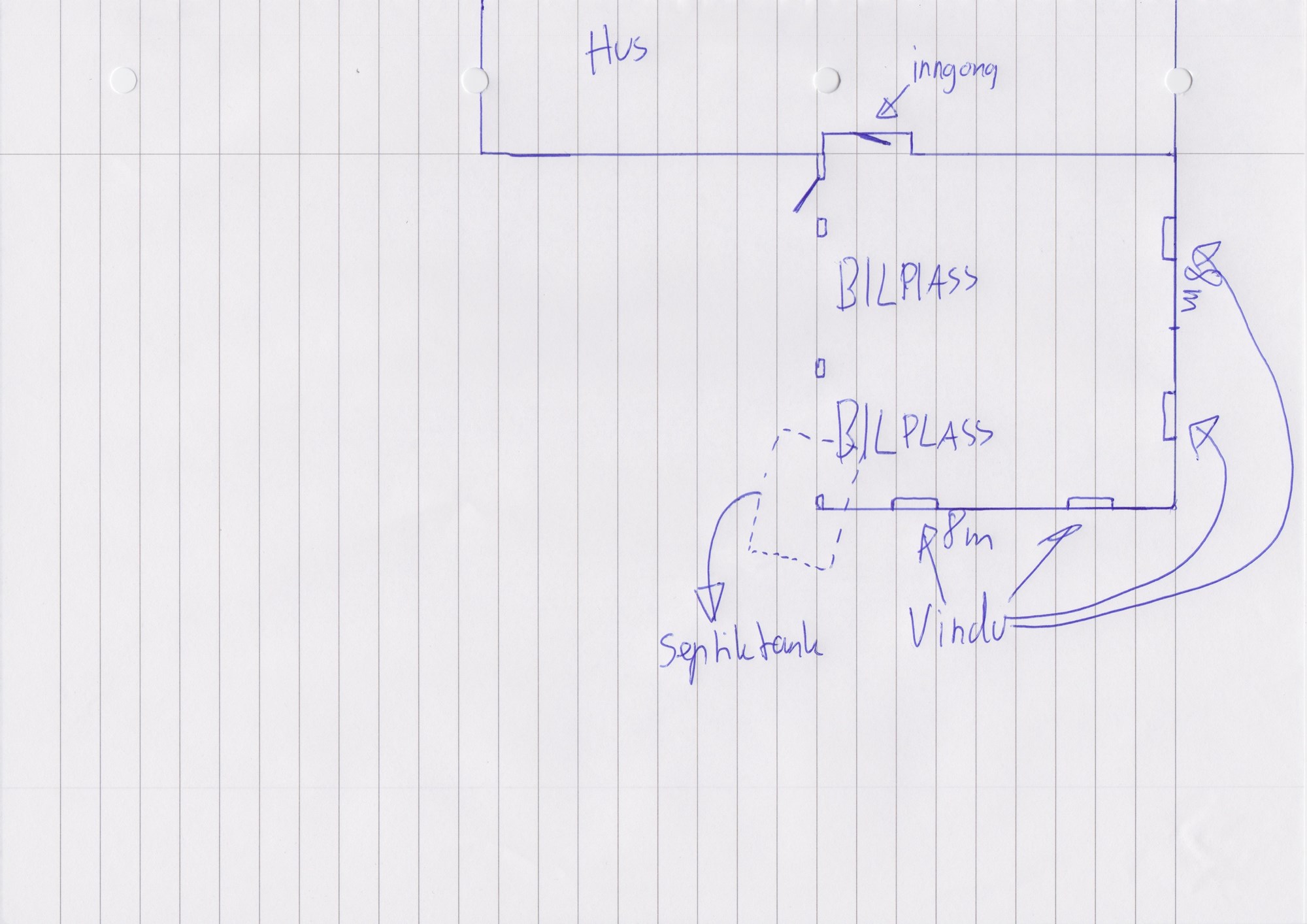 Eg skal no igong med å sette opp ein dobbel garasje på nedsida av huset. Garasjen vil bli bygd ilag med huset sin kjellar. Ei enkel teikning: