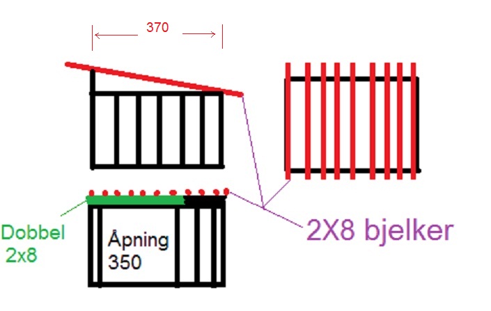 Bygger utstue som jeg skal ha torvtak på. Størrelse på bygget er 370X440. Blir skråtak, Taksperrene over 370 veggen blir på 440. Holder det med 2X8 på denne bredden?