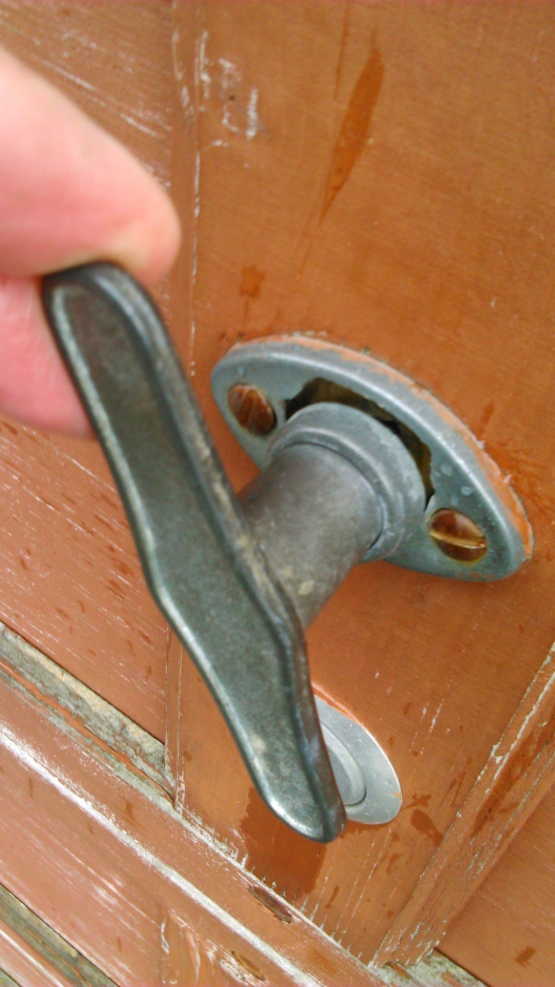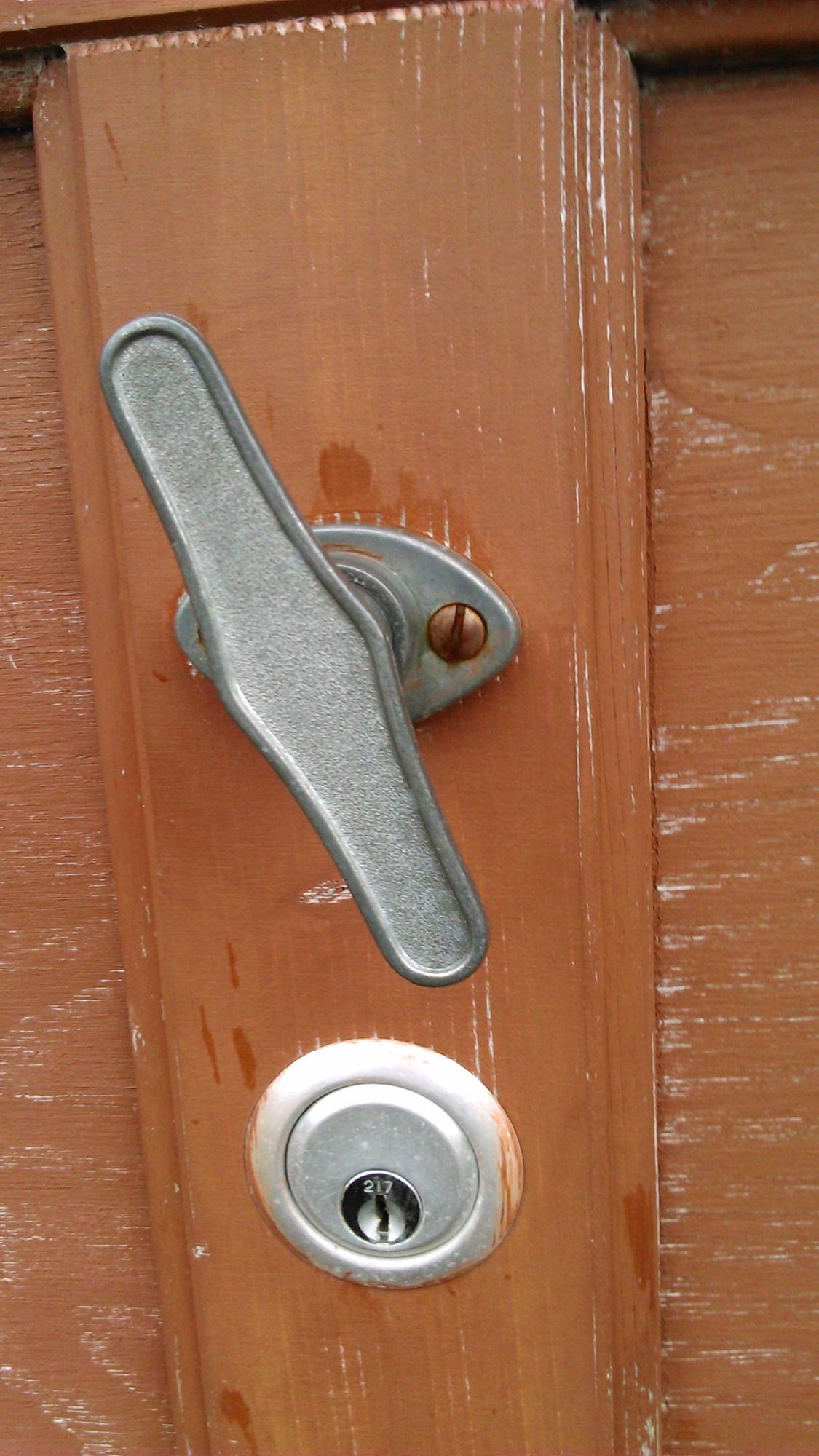 Ei skive innenfor håndtaket på garasjeporten er skadet. Følgen er at håndtaket forsvinner et stykke innover. Og skiven på innsiden følger med. Dermed fungerer ikke låsmekanismen på innsiden som den skal.