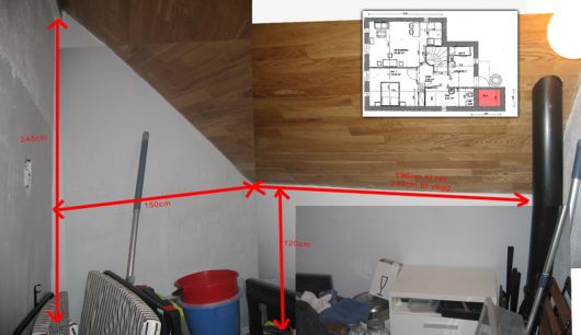 Gjelder øvre etasje i en teglsteinsbygård fra ca 1900 (selv om akkurat dette rommet muligens er bygd på senere), regner med at det er tegl rett bak pussen på veggen. Det er fliser på gulv og parkett (!) i skråtak.