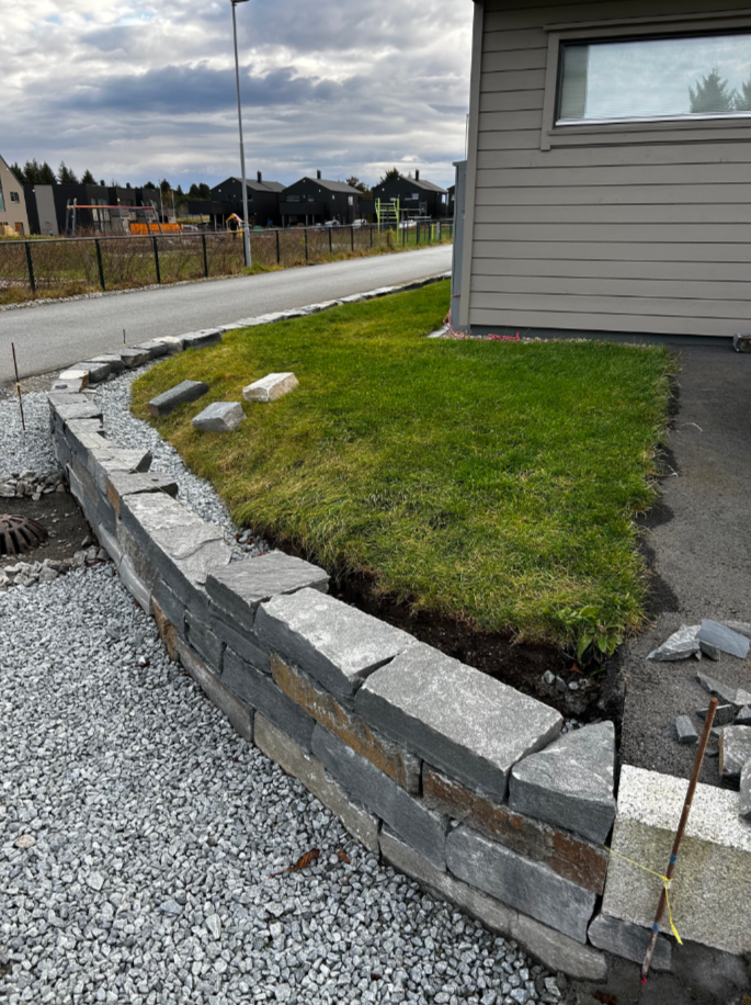 Vi holder å lage en støttemur av naturstein (håndstein). Den blir ca. 26 meter lang og 50 cm høy (varierer noe). Grunnlaget er av 11-16 mm pukk og hele nabolaget er nytt for 2-3 år siden og grunnen under der igjen skal være godt drenert. Vi har også fylt bak med 16-32 mm pukk for drenering.