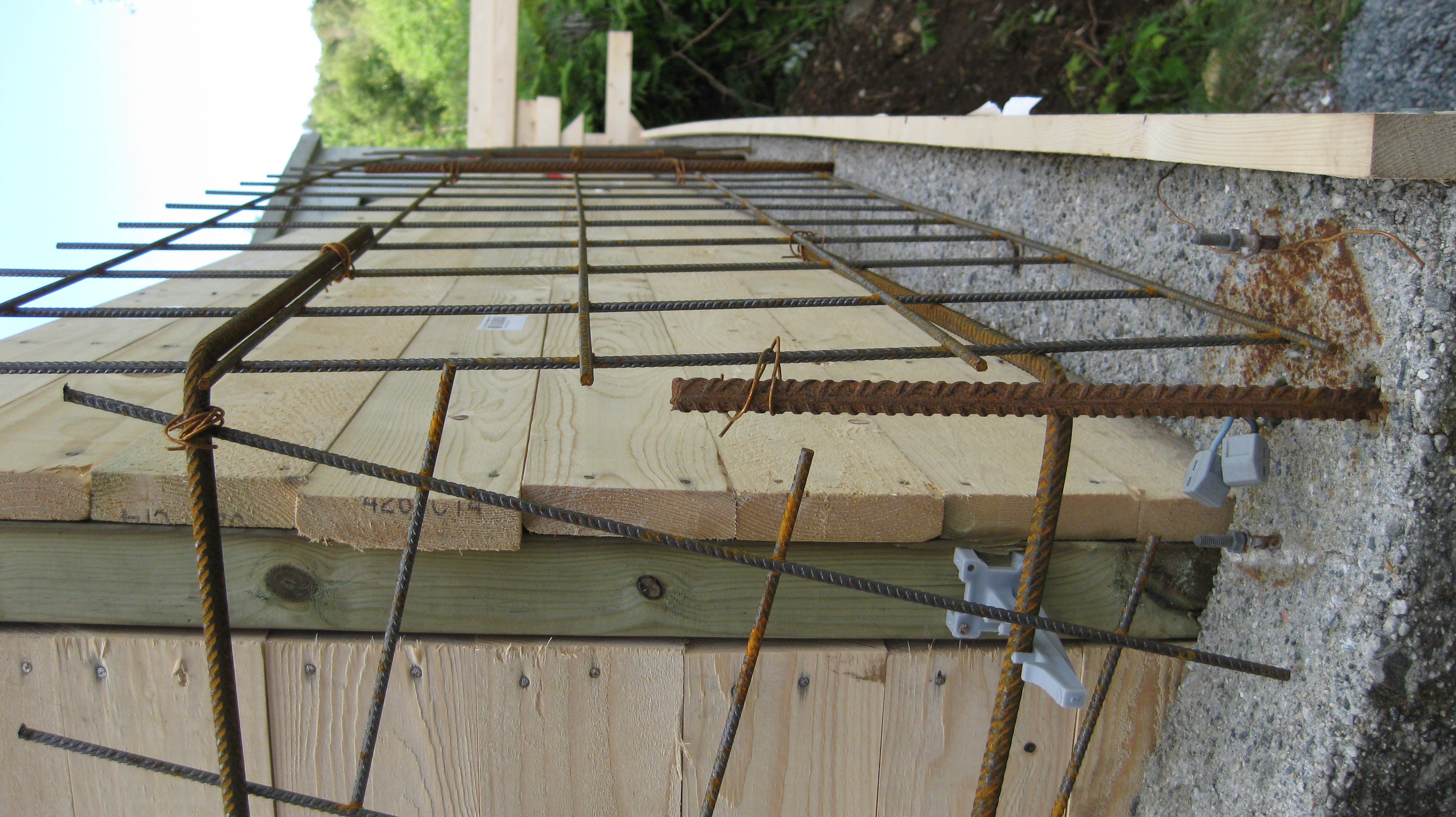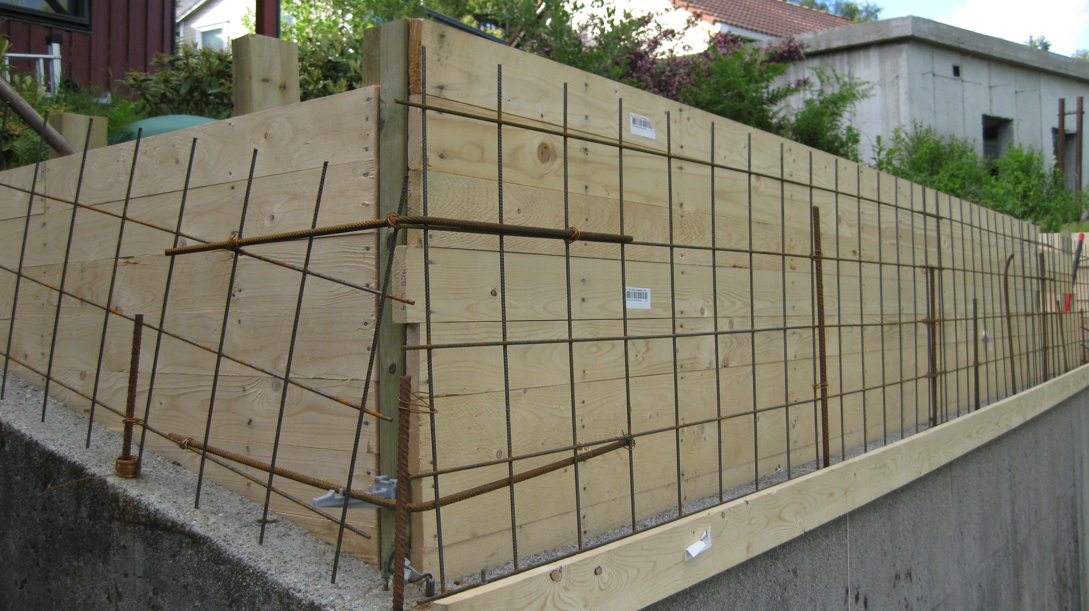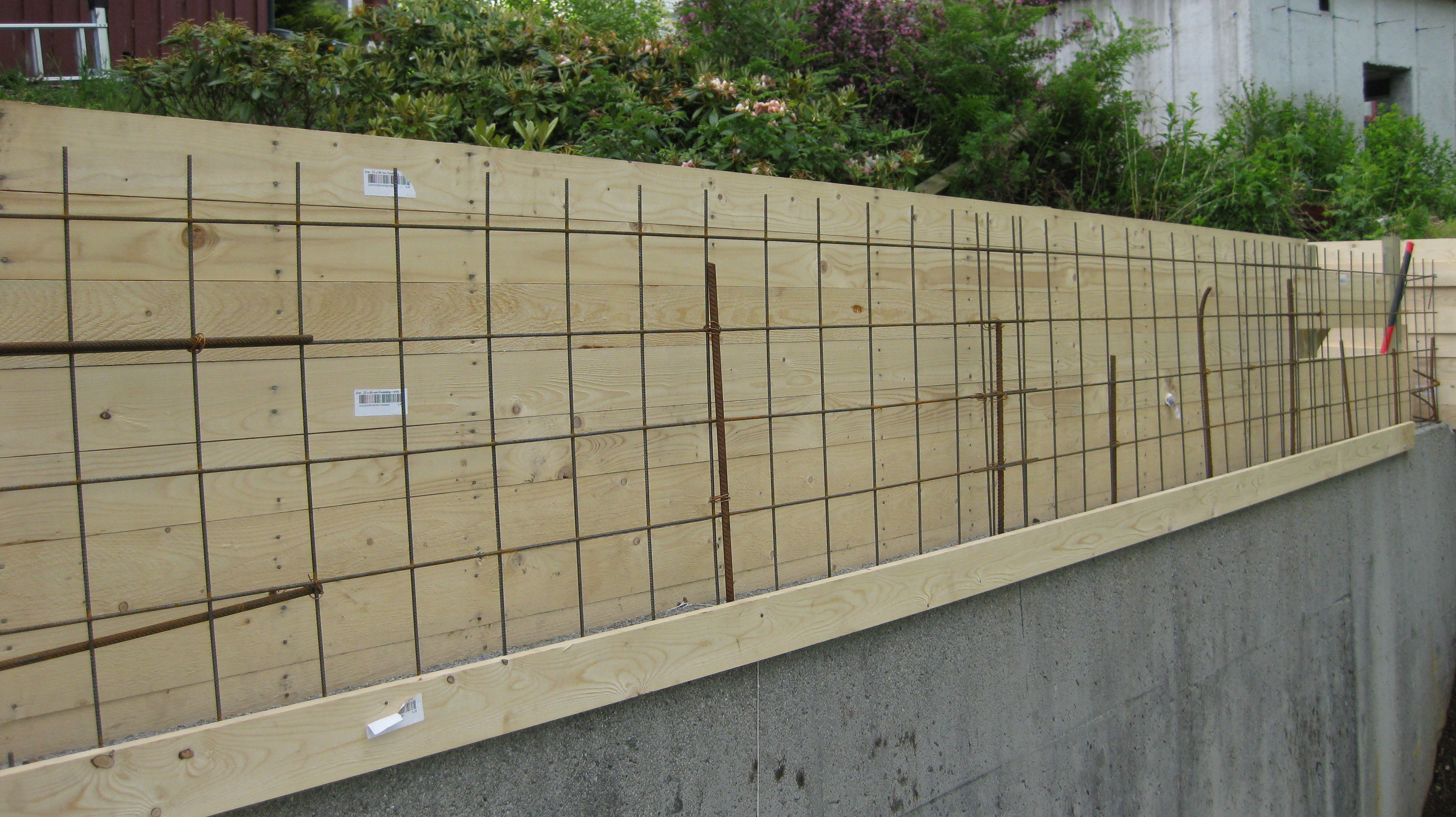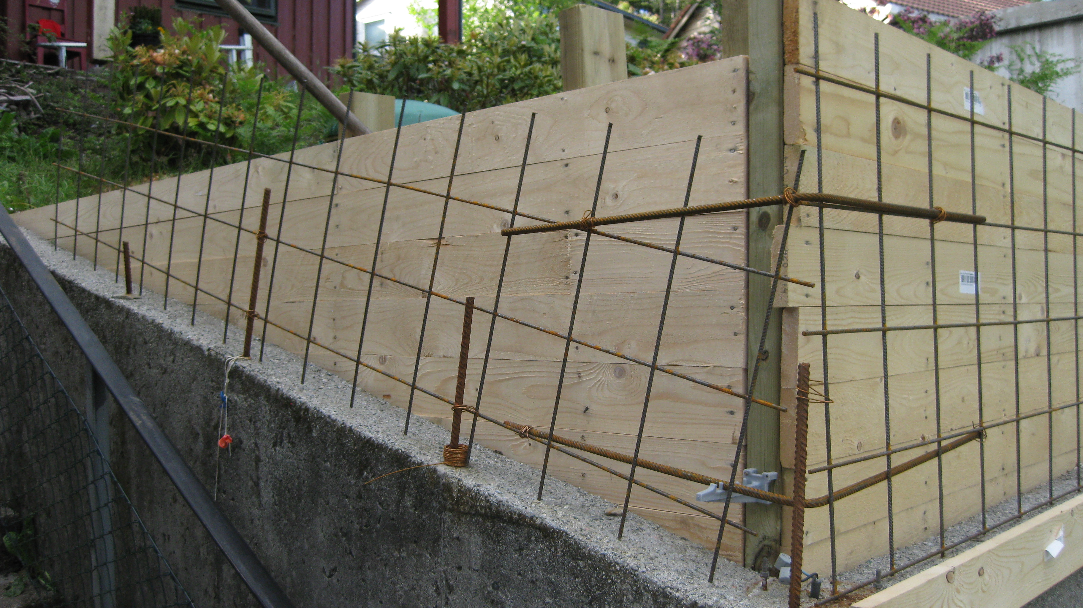 Som dere ser har jeg laget forskaling (halvveis) for skjøting på eksisterende mur. Har boret nedi 16 mm jern og bundet fast nett og to vinkler på hjørnene. Er dette tilstrekkelig med armering på en 15 cm tykk mur?