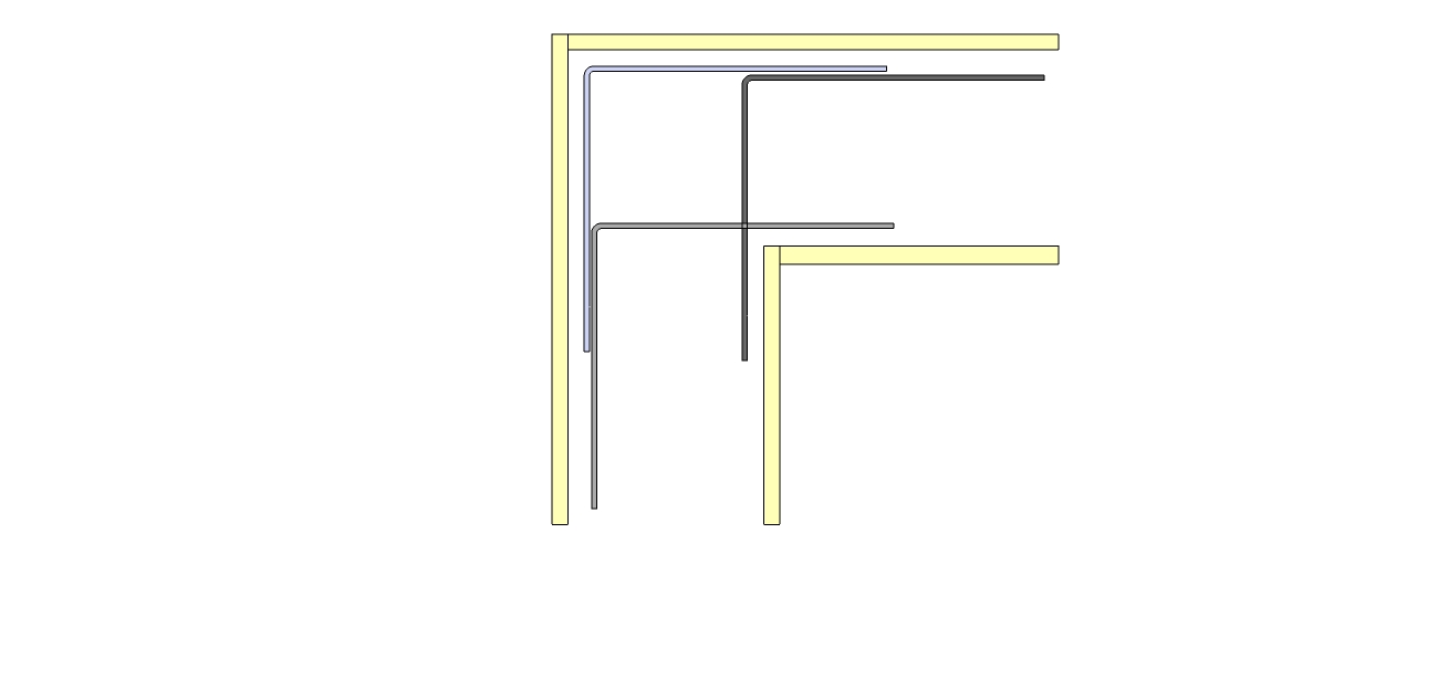 I hjørnene fører du armeringen helt ut, minus overdekning, slik at den krysser.  I tillegg kan du legge ned tre armeringsbøyler i hvert hjørne, i henhold til denne prinsippskissen.  Men det er mulig at en slik hjørnearmering er litt overkill for en vanlig enebolig...