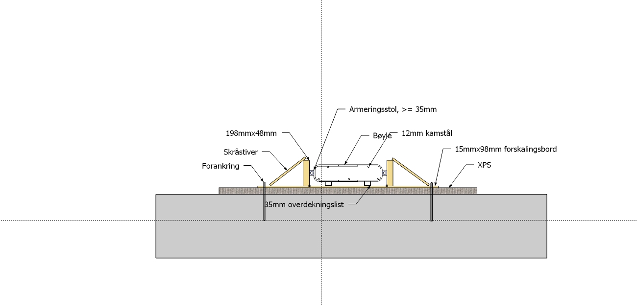 Spalten under forskalingen kan du tette med småbiter av forskalingsbord eller rett og slett sprøyte inn byggskum.  Ser også at jeg tegnet inn en armeringsstol på hver side, men det holder strengt tatt å sette den på den ene siden.  Poenget er jo bare å sikre at armeringen ligger riktig og ikke forskyver seg når du begynner å støpe.  Bøylene skal seff bindes til stolene med bindetråd.  Det er normalt ikke nødvendig å binde stolene til overdekningslistene.