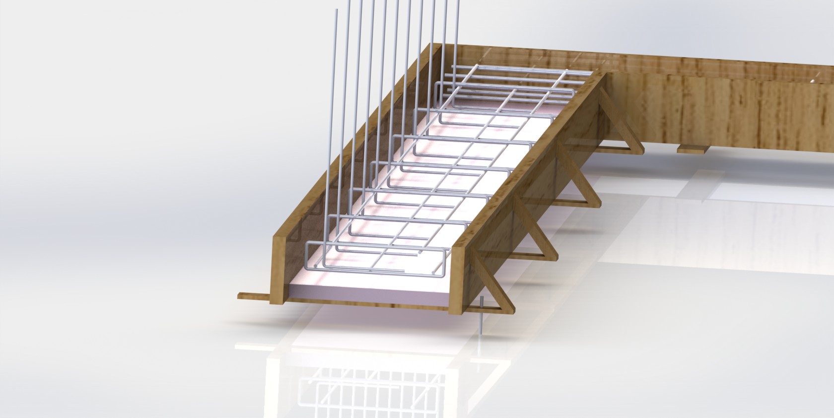 Armeringsstolene på siden spikres eller skrus i forskalingen. CC på bøylene er 1 meter, du klarer deg sikkert med en armeringsstol for hver andre bøyle.