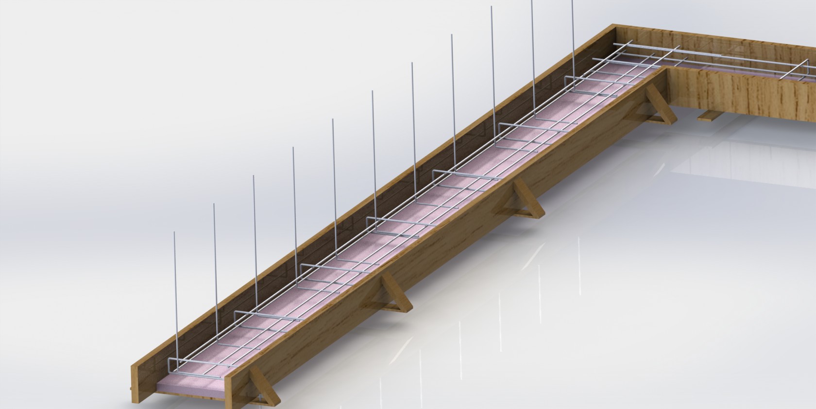 Ser også av beskrivelsen at det skal settes ned 10mm vertikale skjøtejern i ytterkant av der muren kommer, lengde 1m med CC 60cm. Skjøtejernene bør du få bøyet til med en 90 graders vinkel slik at det er enkelt å feste dem til resten av armeringen og få dem til å stå i riktig posisjon. Det er også lurt å rette inn det ytterste overliggende kamstålet slik at det står i riktig akse for å binde fast skjøtejernene.