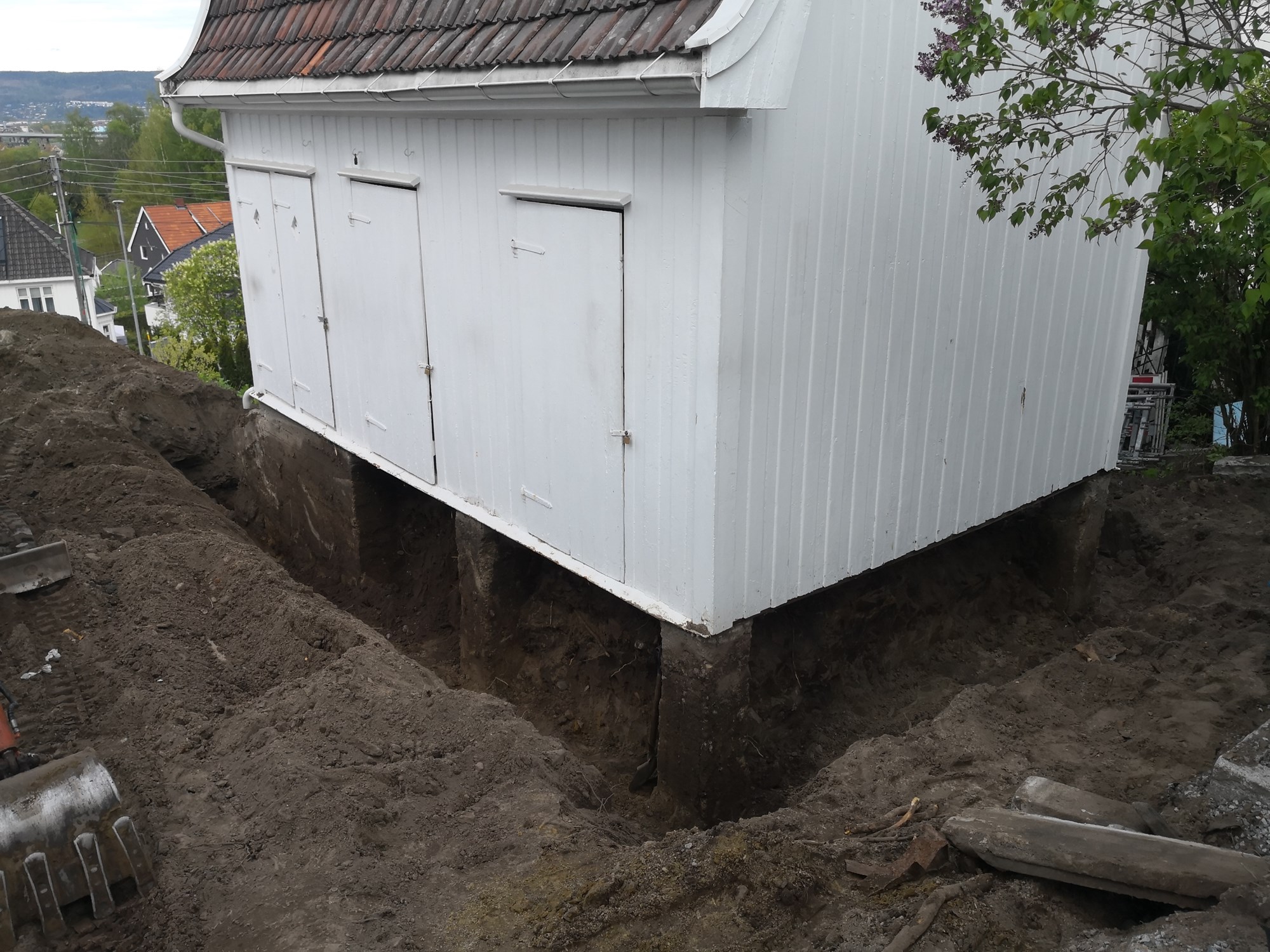 Det ser jo ut til å være bygget på betong påler og er det ikke kjeller i det er det jo ingen vits å drenere så dypt som dette.