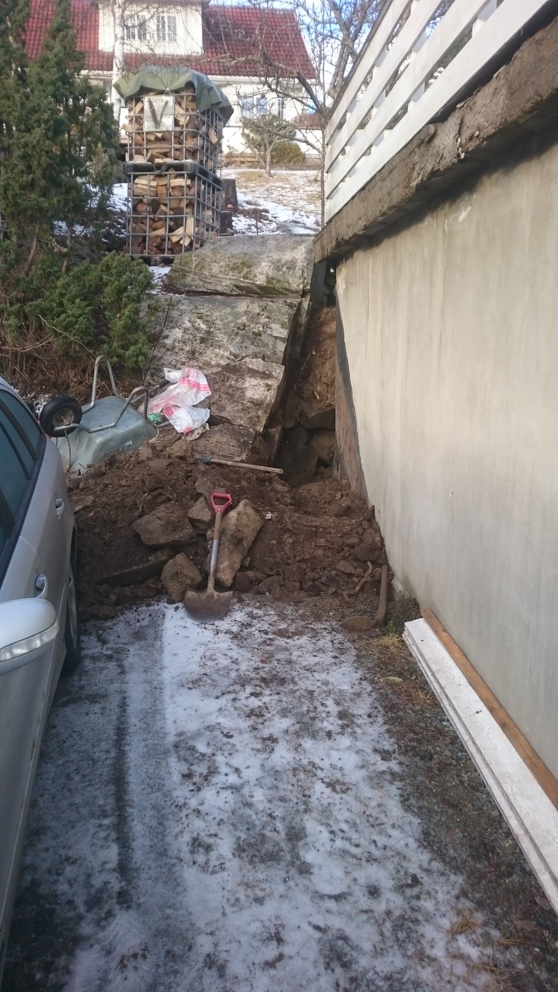Veggen er endevegg og bærer 20 cm lecaplank med takterrasse over.