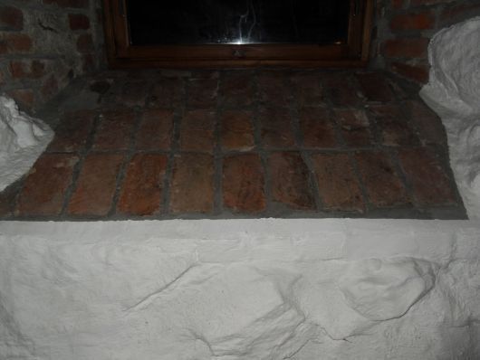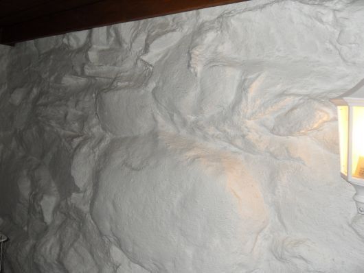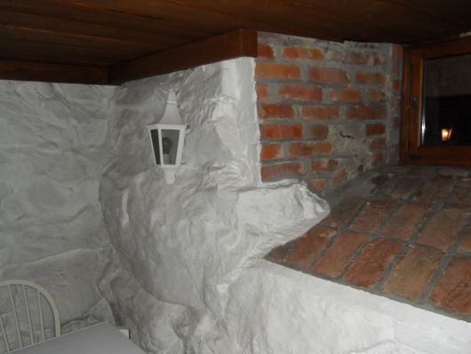 Veggen er 1,1 meter tjukk  Shocked og består av steiner som er stablet over hverandre. Den er pusset opp innvendig med "noe" og malt hvitt. Du ser klart og tydelig alle steinene som er stablet over hverandre. Skal prøve å knipse et bilde og legge det ved.