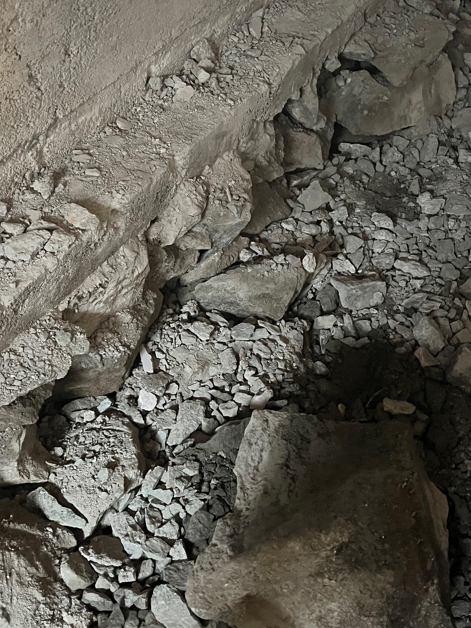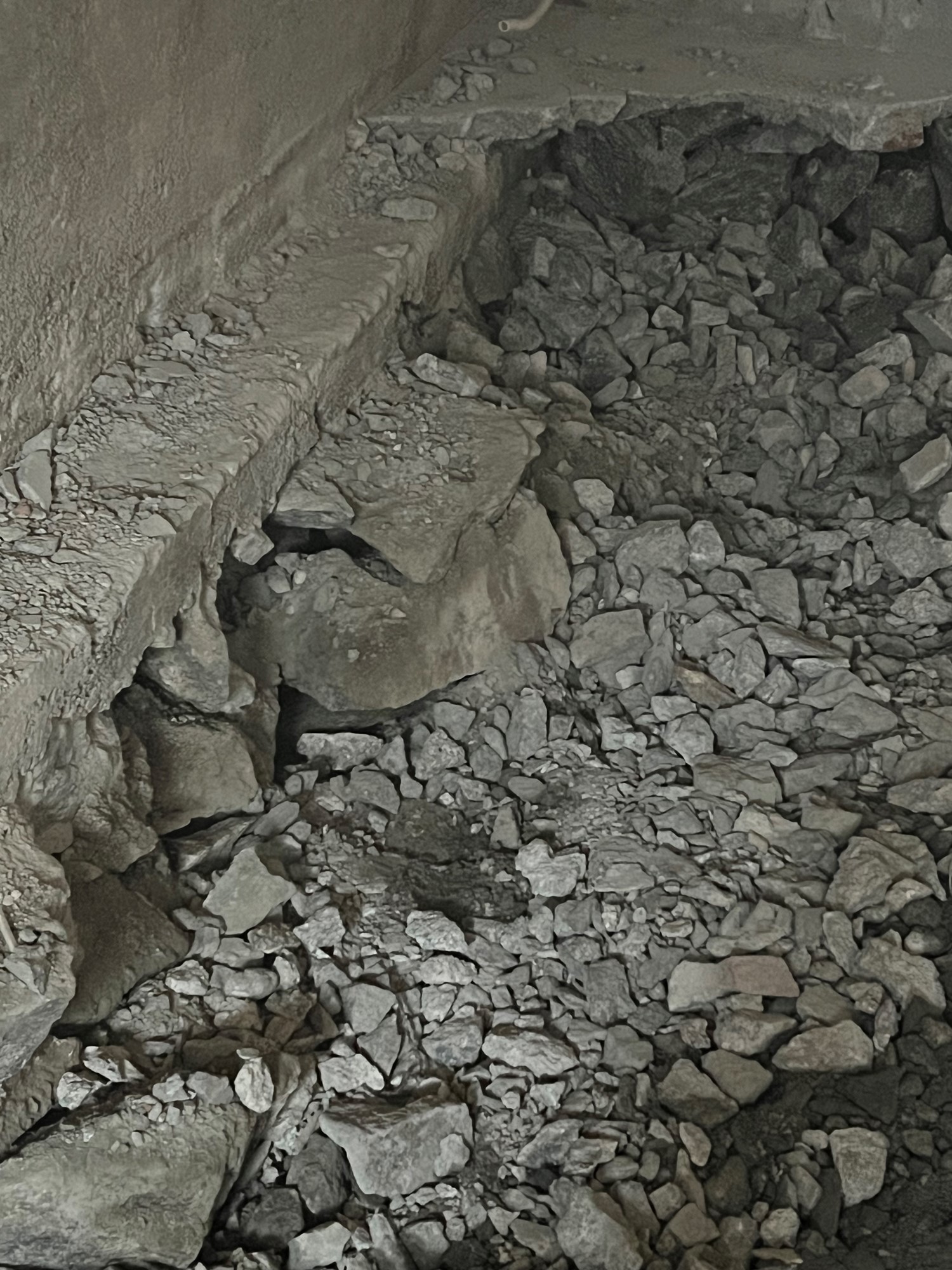 Jeg begynte til slutt med å pigge opp gulvet i kjelleren og tanken var å ta dreneringen i samme slengen. Kjelleren har virket tørr nok og jeg antok at det var til dels fordi grunnmuren gikk så pass dypt under bakken. I et hus fra tidlig 50-tall, var det kjærkomment her på Vestlandet. Første overraskelse kom etter at jeg fant ut at gulvet bare var snaue 3 centimeter med betong som dere ser på tegningene. Det som derimot har gitt meg et skikkelig støkk er at grunnmuren går et par stakkarslig centimeter under bakken og står på stein. Et enormt avvik fra plantegningene jeg har vedlagt her.