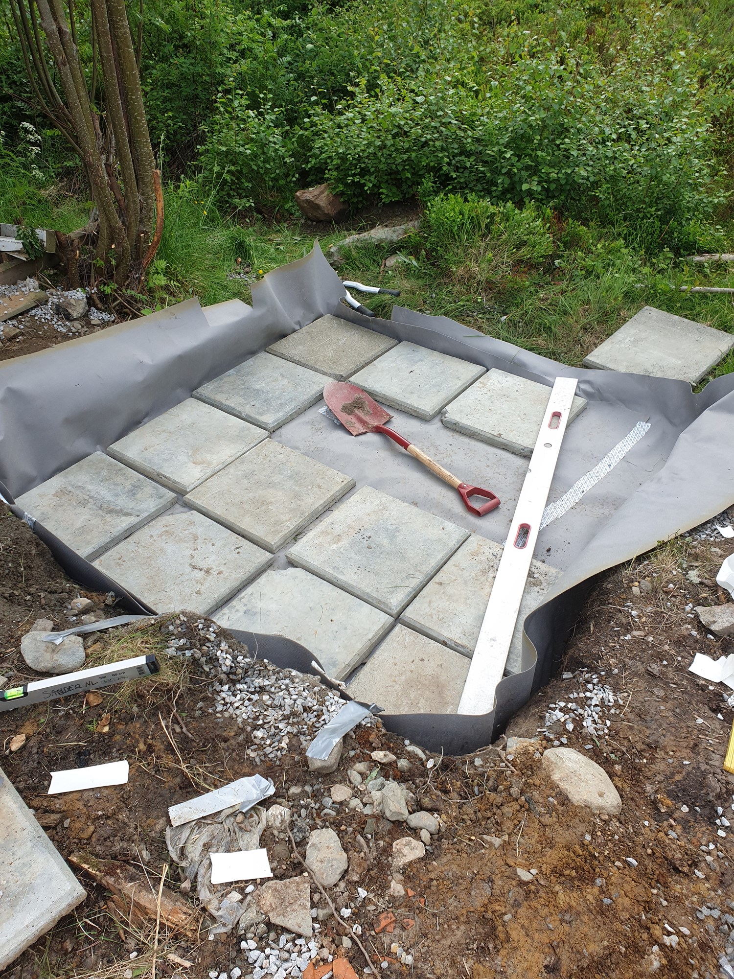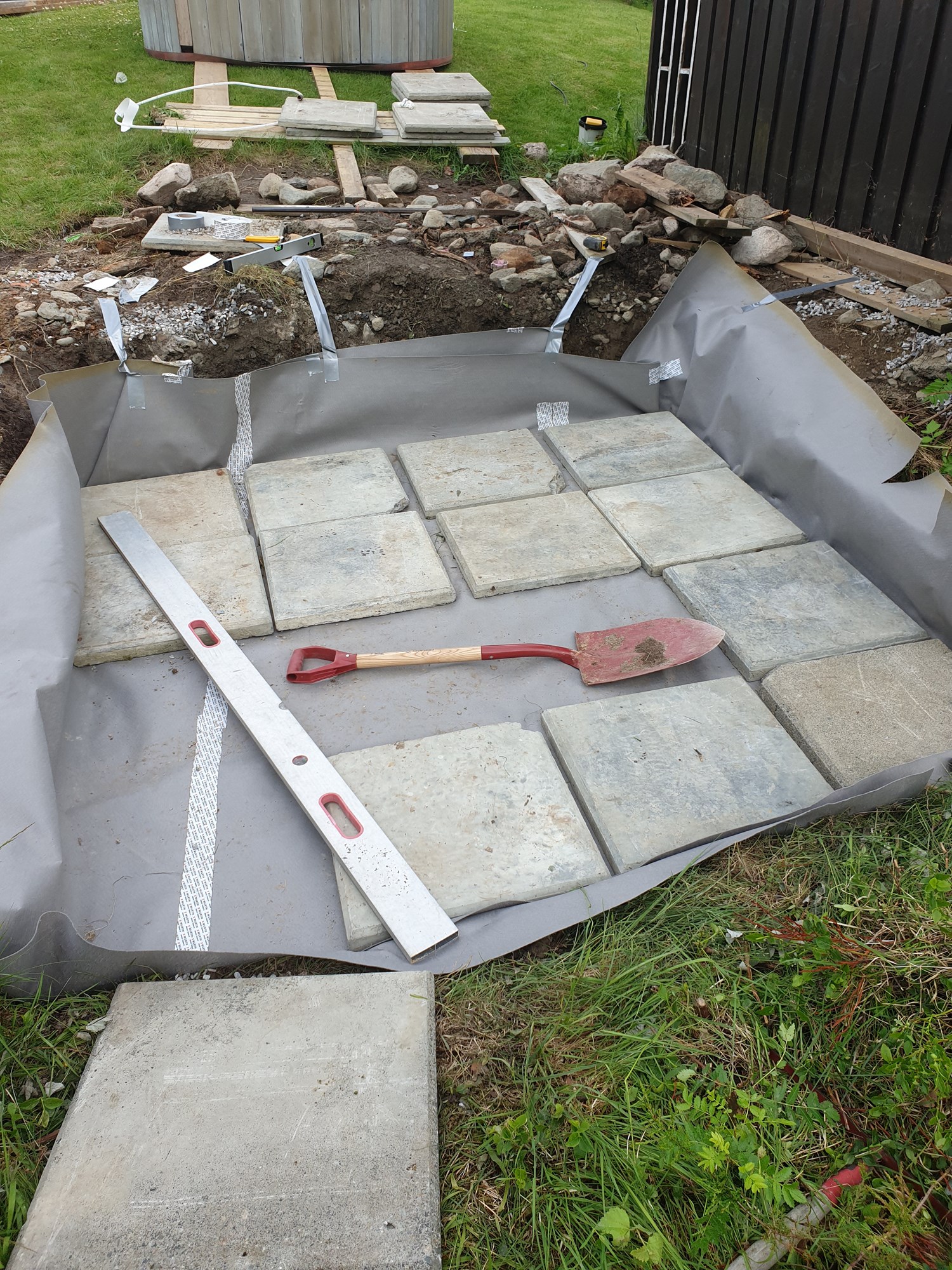 Lager ny terrasse(frittstående) der det tidligere stod en terrasse med boblebad oppå, badet veier ca. 1,5 tonnn med folk i). Har næ revet terrasse og gravd hull til badet så det står på bakken og er ca. 50-60 cm under terrassen vi skal bygge rundt. Jorden under er ganske hard og jeg har fylt i et lag med grus på 6-8 cm. Har så lagt på fiberduk. Tenkte først å legge på armerte betongheller (50x50x5) som vi hadde liggende, også legge badet rett på dem, men ser det blir et problem og de helt jevne. Vurderer å legge ned betonghellene son planlagt (4x4), men så bruke trevirke under der igjen der jeg tilpasser klosser som kan ligge mellom hellene og trevirket.